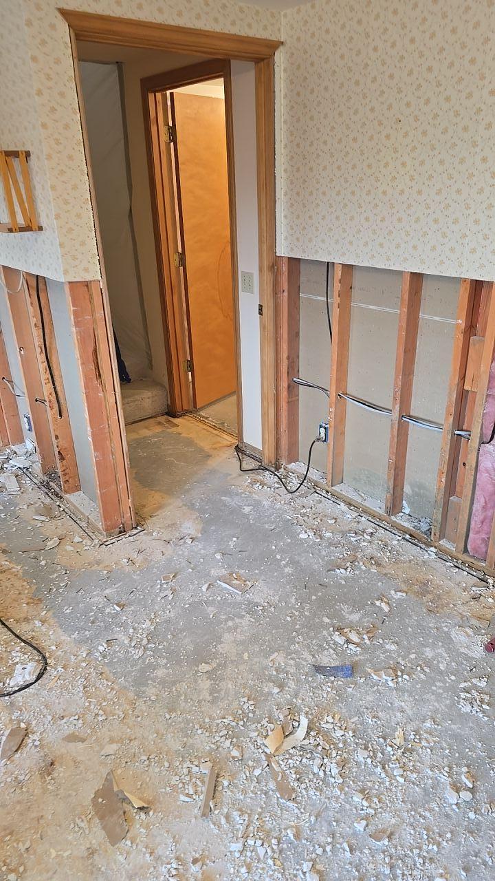 Exposed wall studs and subflooring undergoing decontamination and drying. We safely remove impacted drywall and insulation to treat the underlying structure for biohazards.