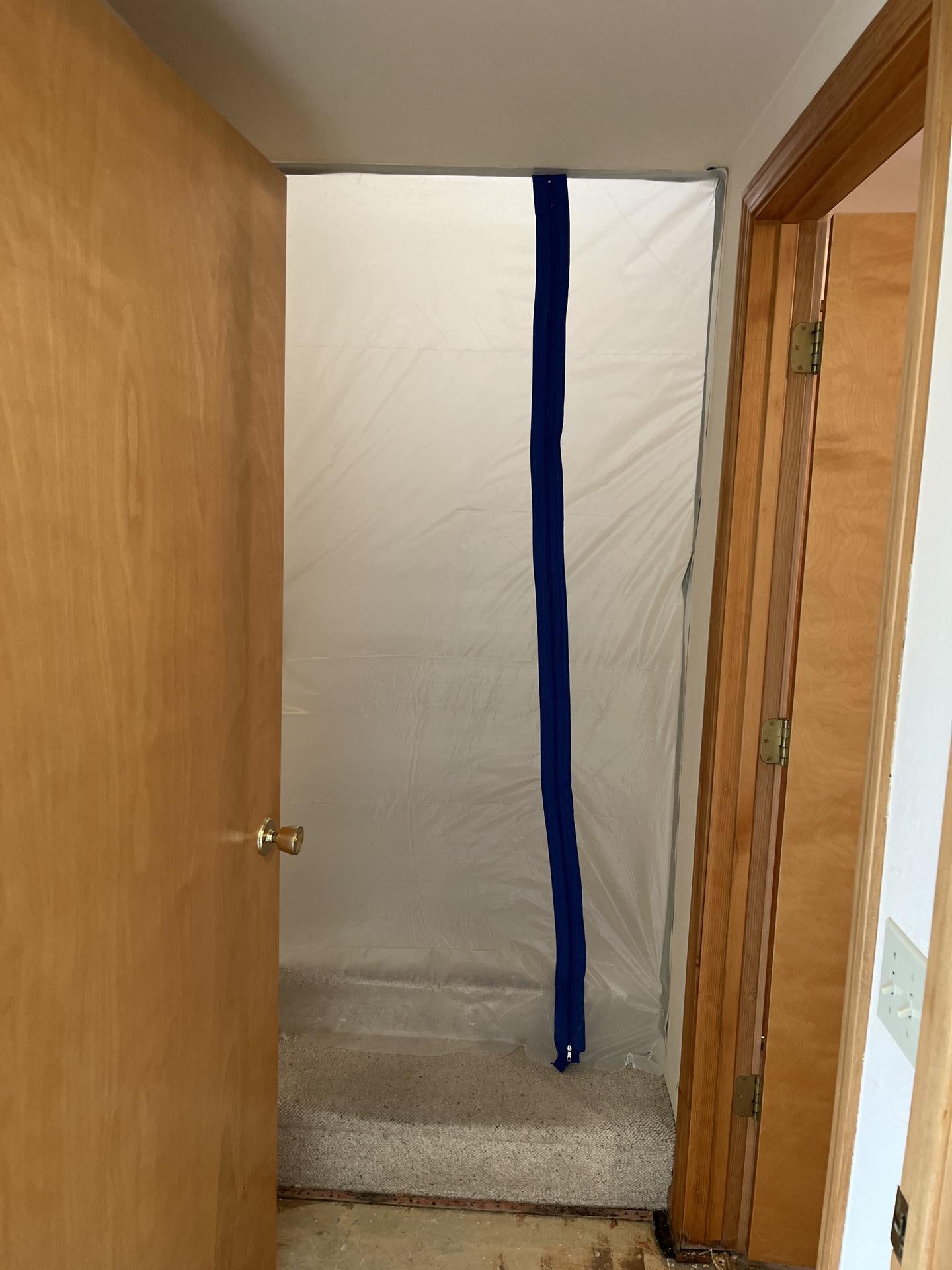 Professional biohazard containment setup using plastic barriers to prevent the spread of contaminants during the sewage cleanup and decontamination process.