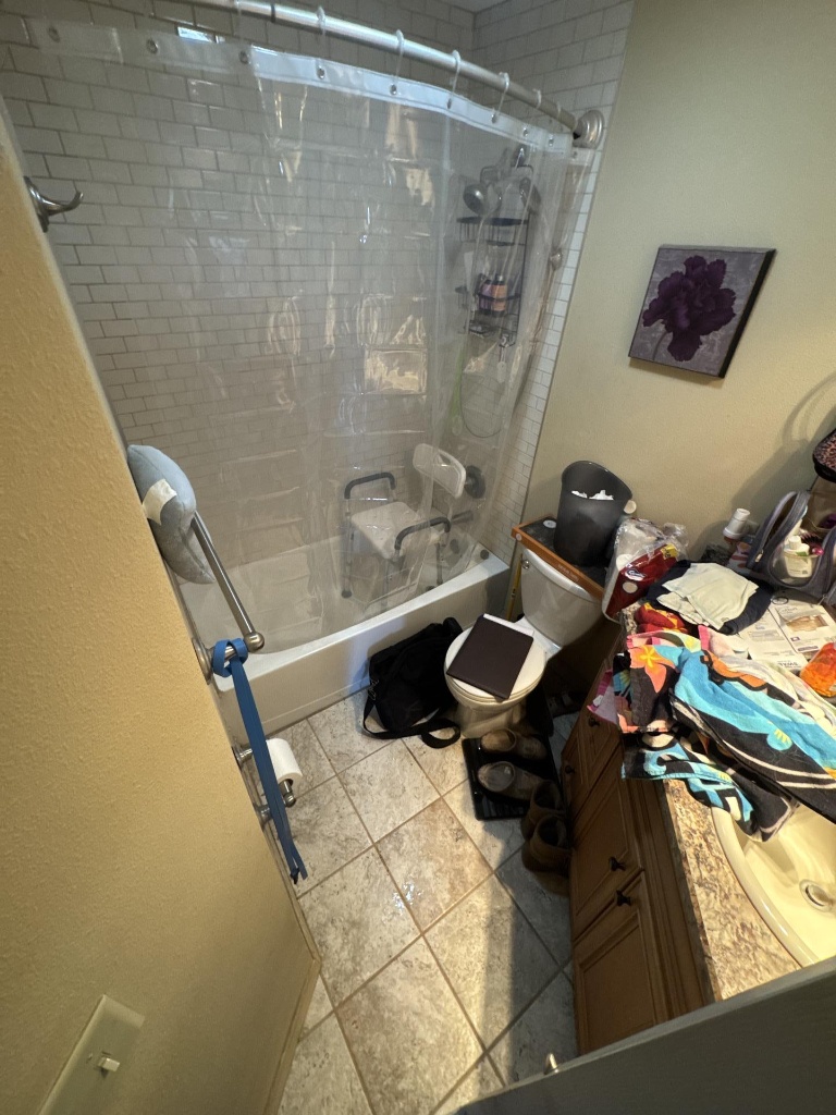 A restoration expert evaluates water damage on bathroom tile flooring during an initial property inspection. Dayspring Restoration provides prompt water mitigation services, including moisture detection and structural drying, to prevent long-term property damage