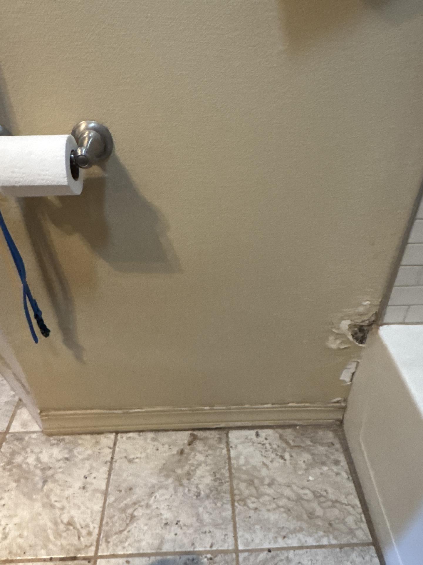 Inspection of water-saturated baseboards and drywall in a residential bathroom. Professional water mitigation involves precise moisture control and extraction to ensure the area is completely dry before finalizing the property restoration process