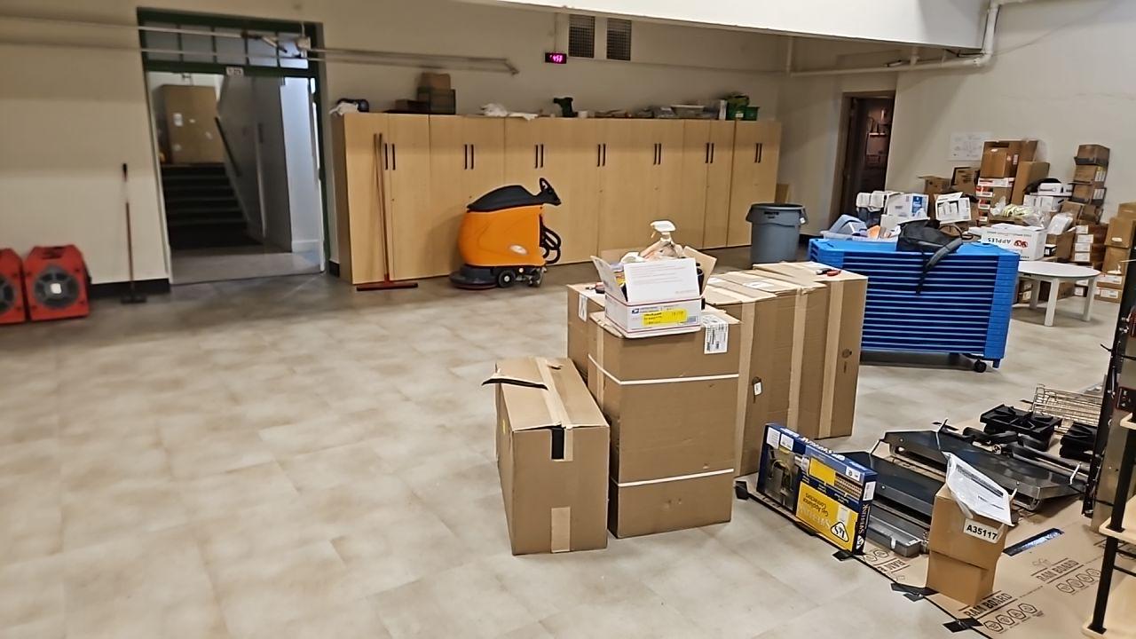 Overview of a large room serving as a base for water damage restoration, featuring various equipment, supplies, and tools, including red air movers and an orange floor scrubber.