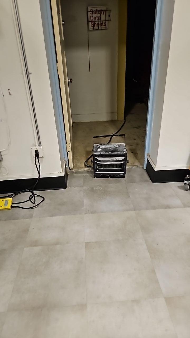 Specialized drying equipment, possibly a dehumidifier, positioned in a doorway to facilitate drying and air circulation in a water-damaged area.