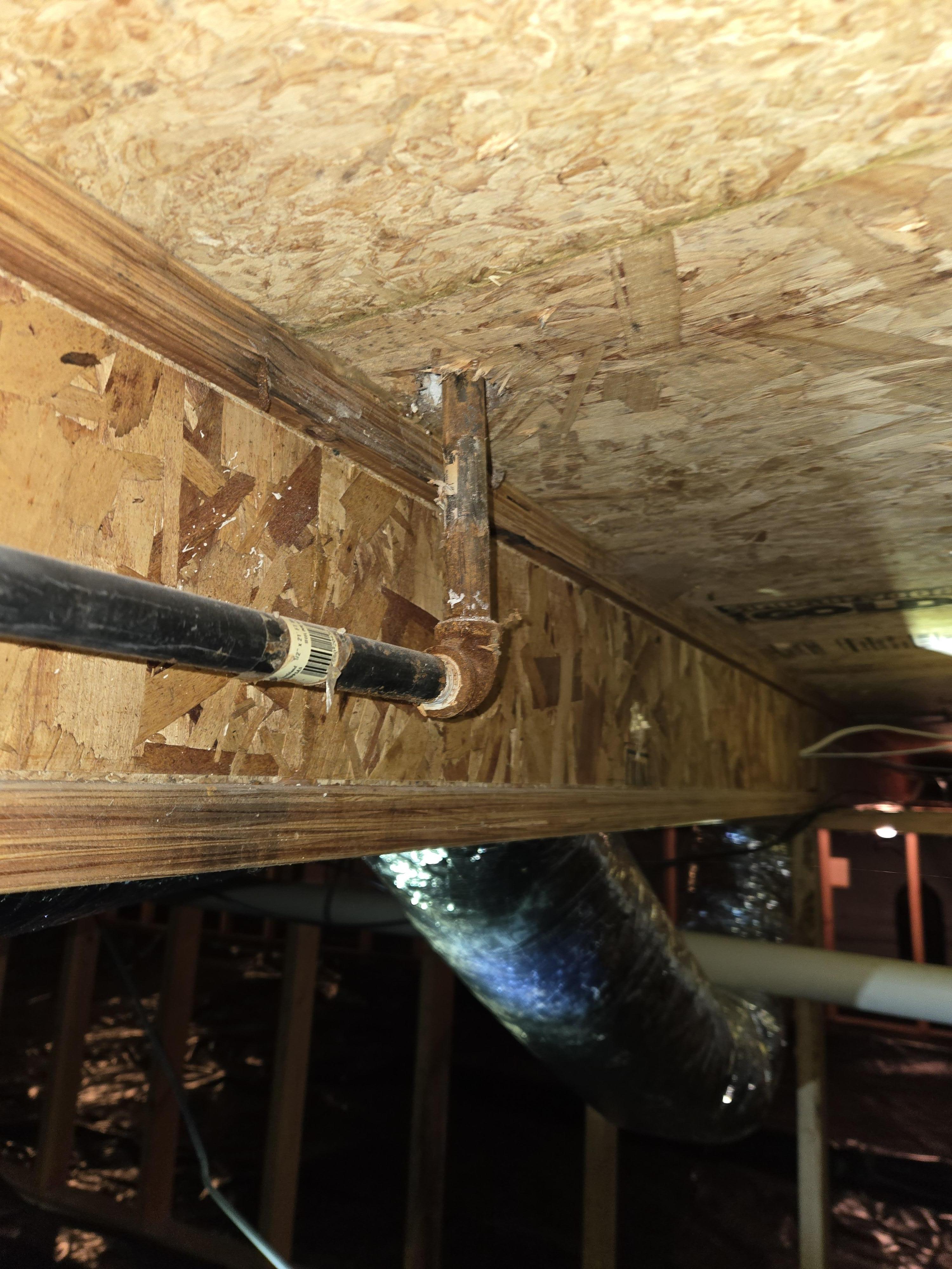 Close-up of a black pipe, possibly a gas line, secured to a wooden joist, with flexible insulated ductwork visible below in the crawlspace.