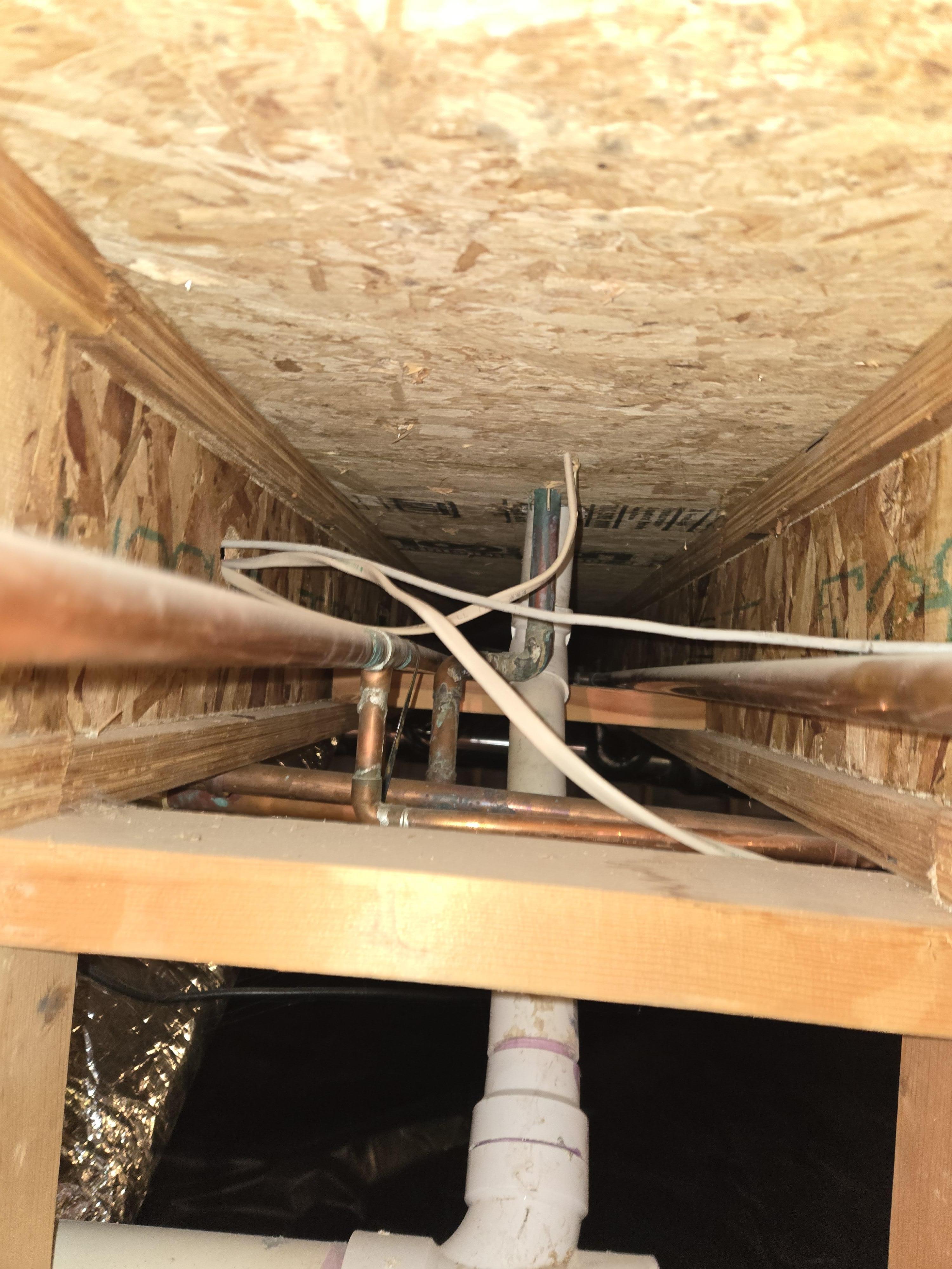 Overview of various copper plumbing pipes and electrical wiring running through wooden support beams in a crawlspace.