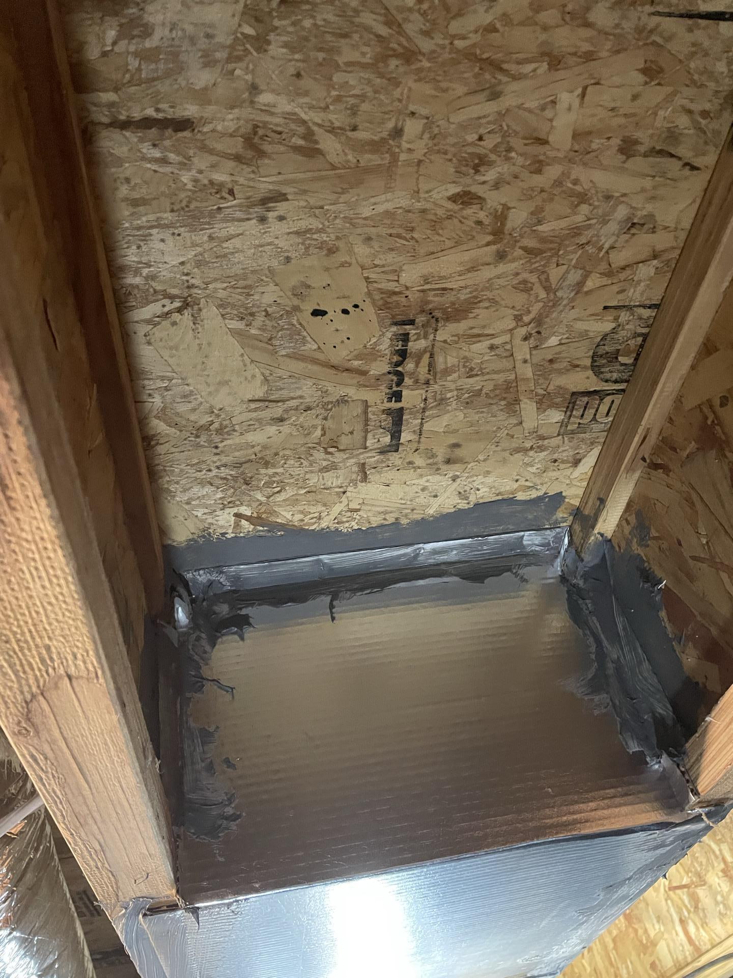 Newly sealed HVAC duct boot or connection in a crawlspace, meticulously applied with mastic sealant and reflective insulation to prevent air leaks and improve efficiency.