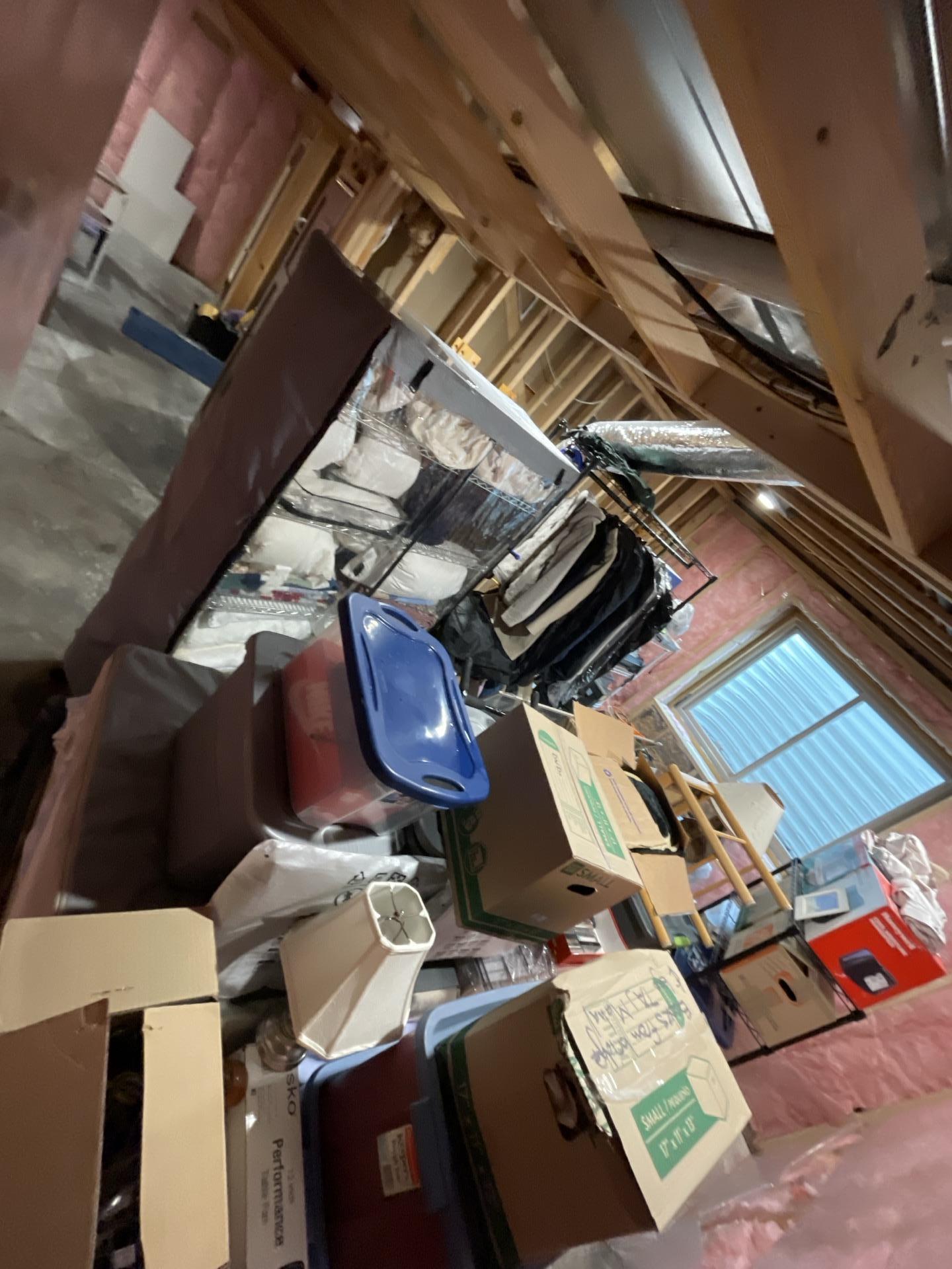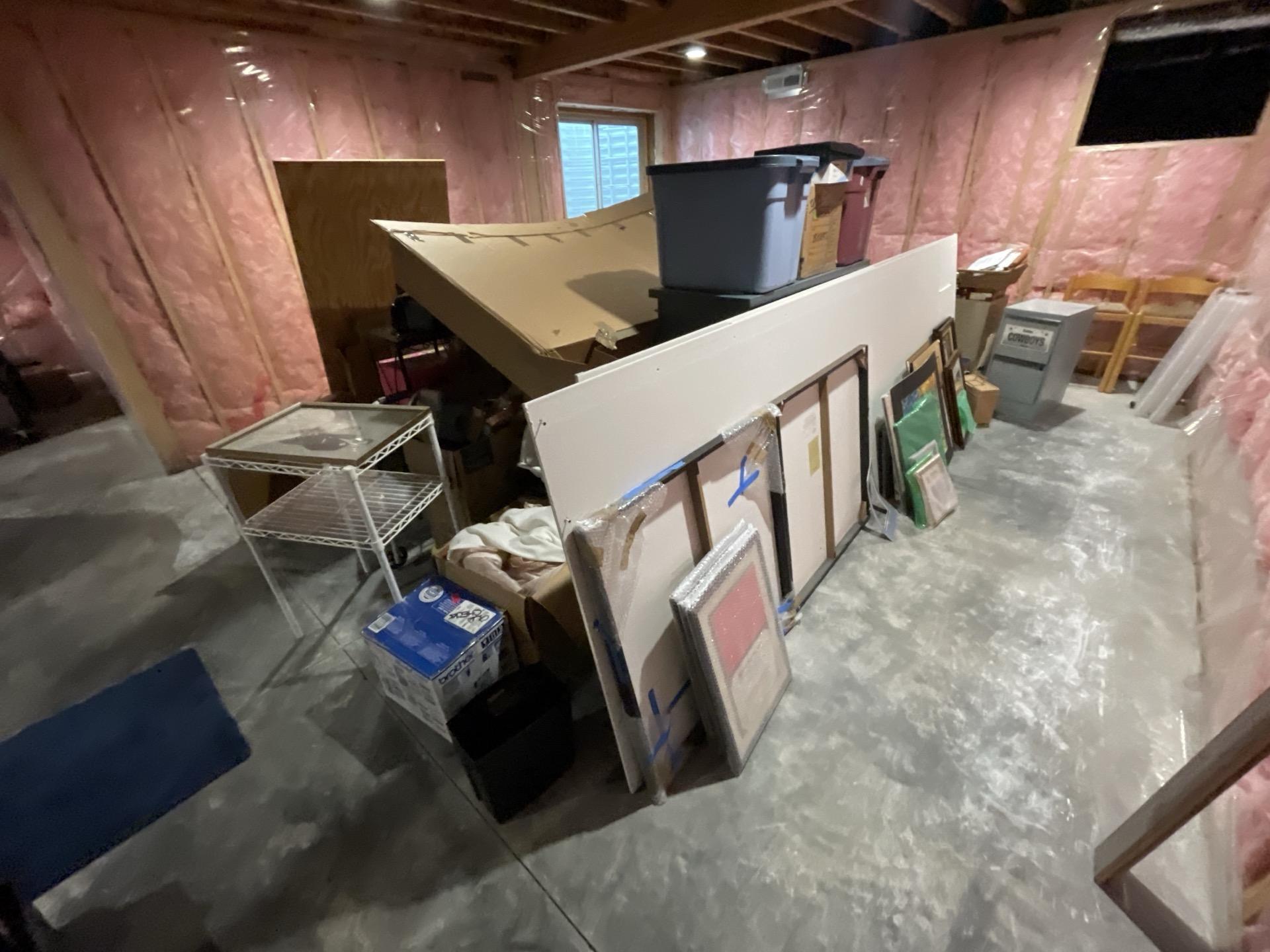 Basement family room or large storage space with stacked items and insulation, undergoing sewage restoration.
