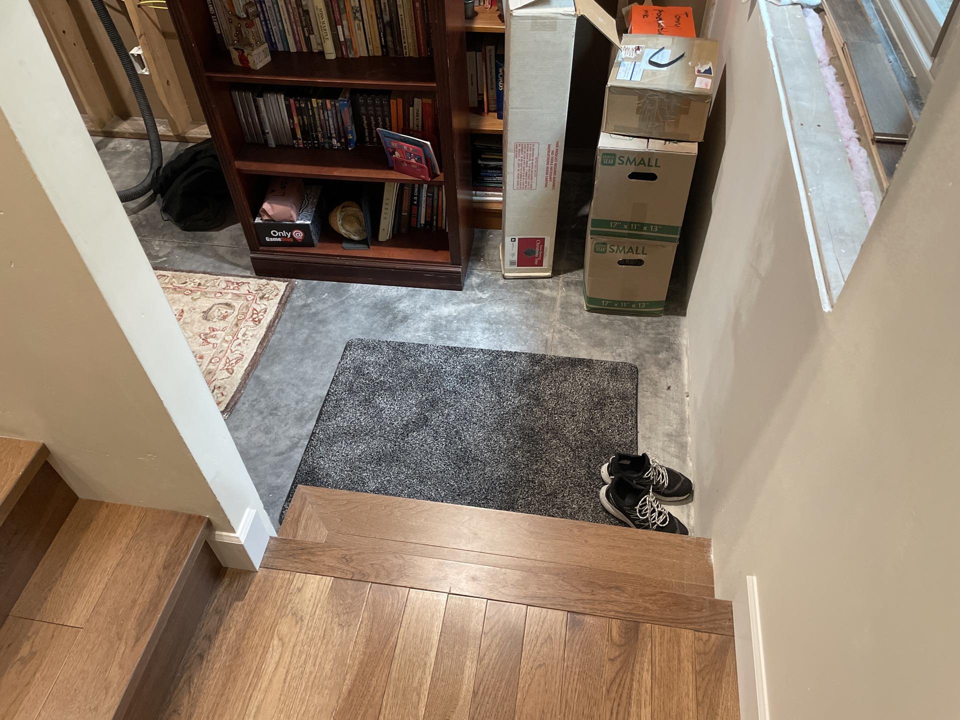 Basement stairs leading to affected areas, indicating an entry point for sewage damage assessment and remediation.