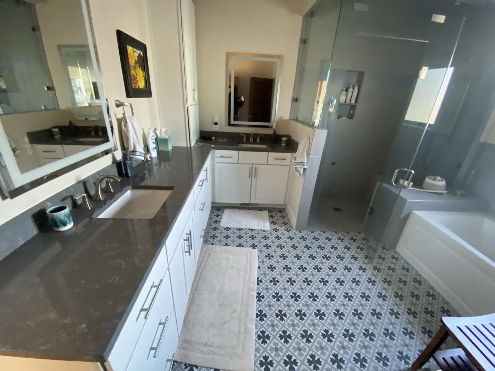 Clean and restored master bathroom with modern vanity and shower, demonstrating the successful completion of sewage service in the master bedroom area.