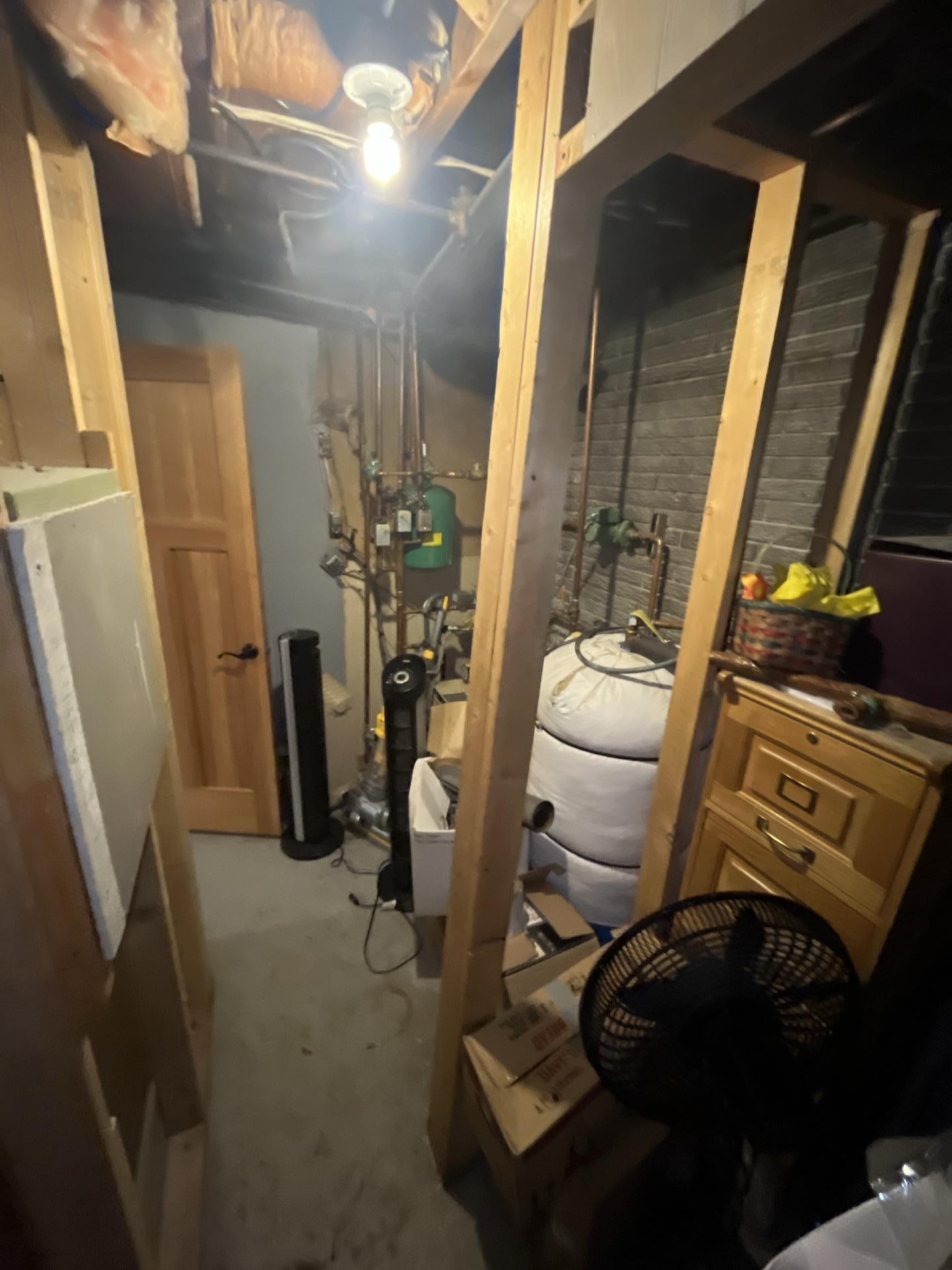 Basement utility room with plumbing and water heating systems, undergoing sewage damage restoration.