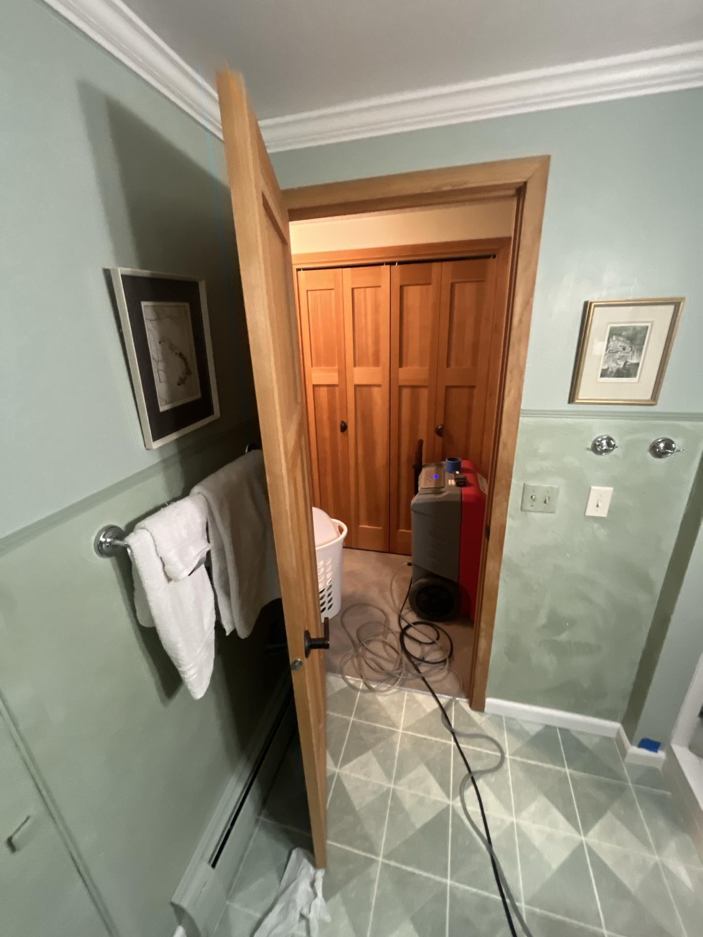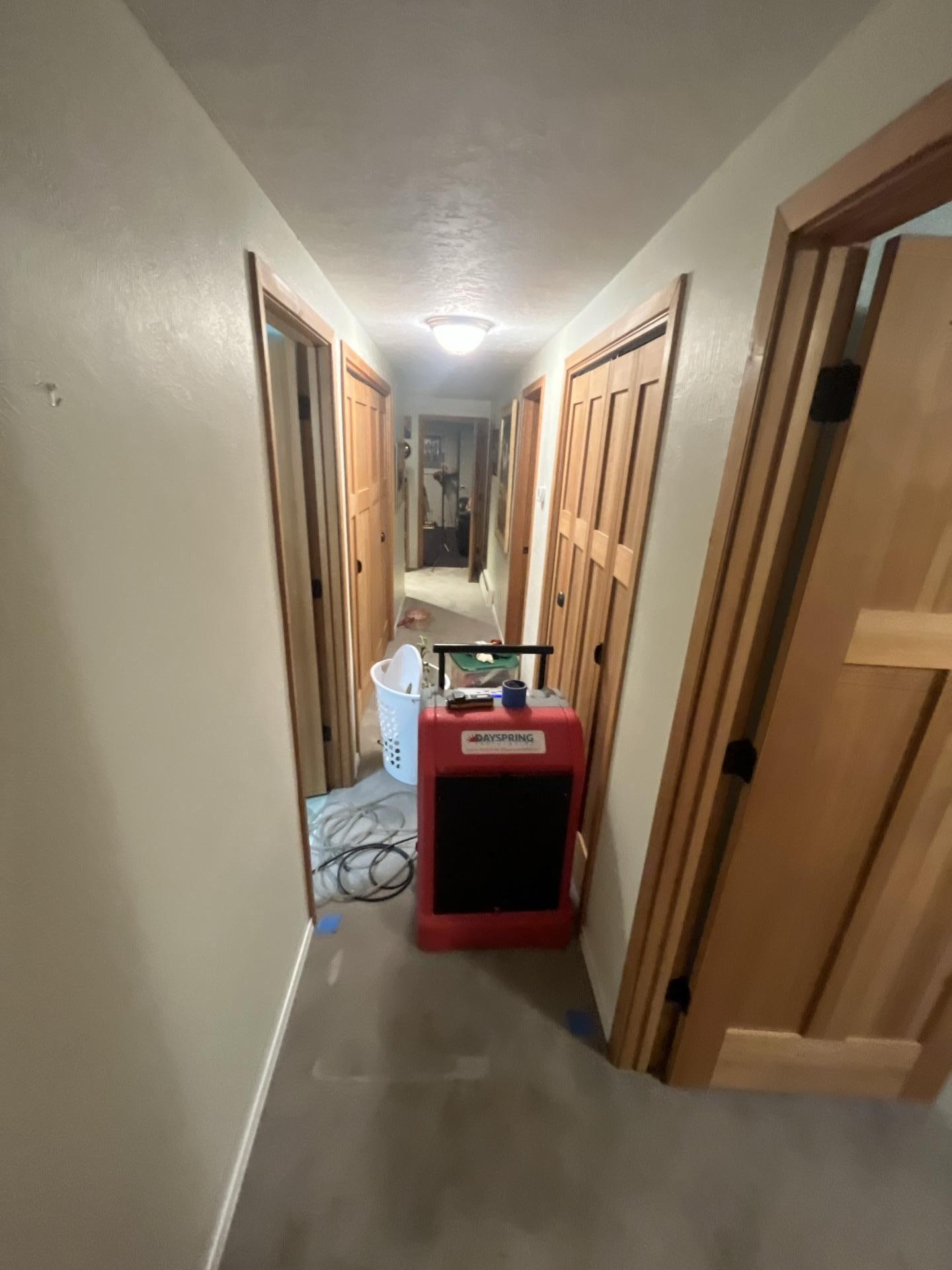 Entrance to a basement bathroom, with drying equipment visible in the adjacent hallway for sewage remediation.