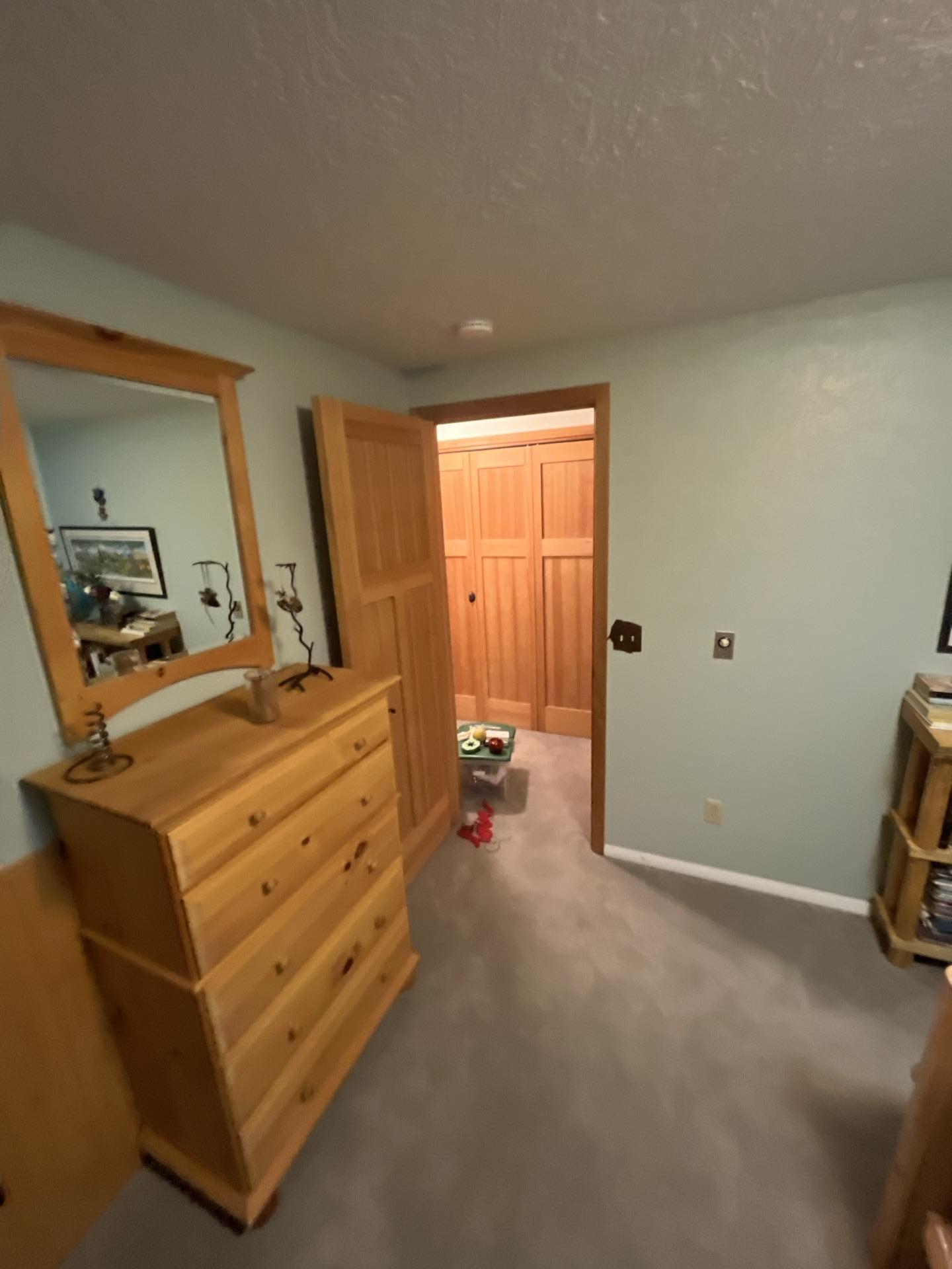 Interior of basement bedroom (Bedroom 1) after professional sewage damage cleanup and drying.