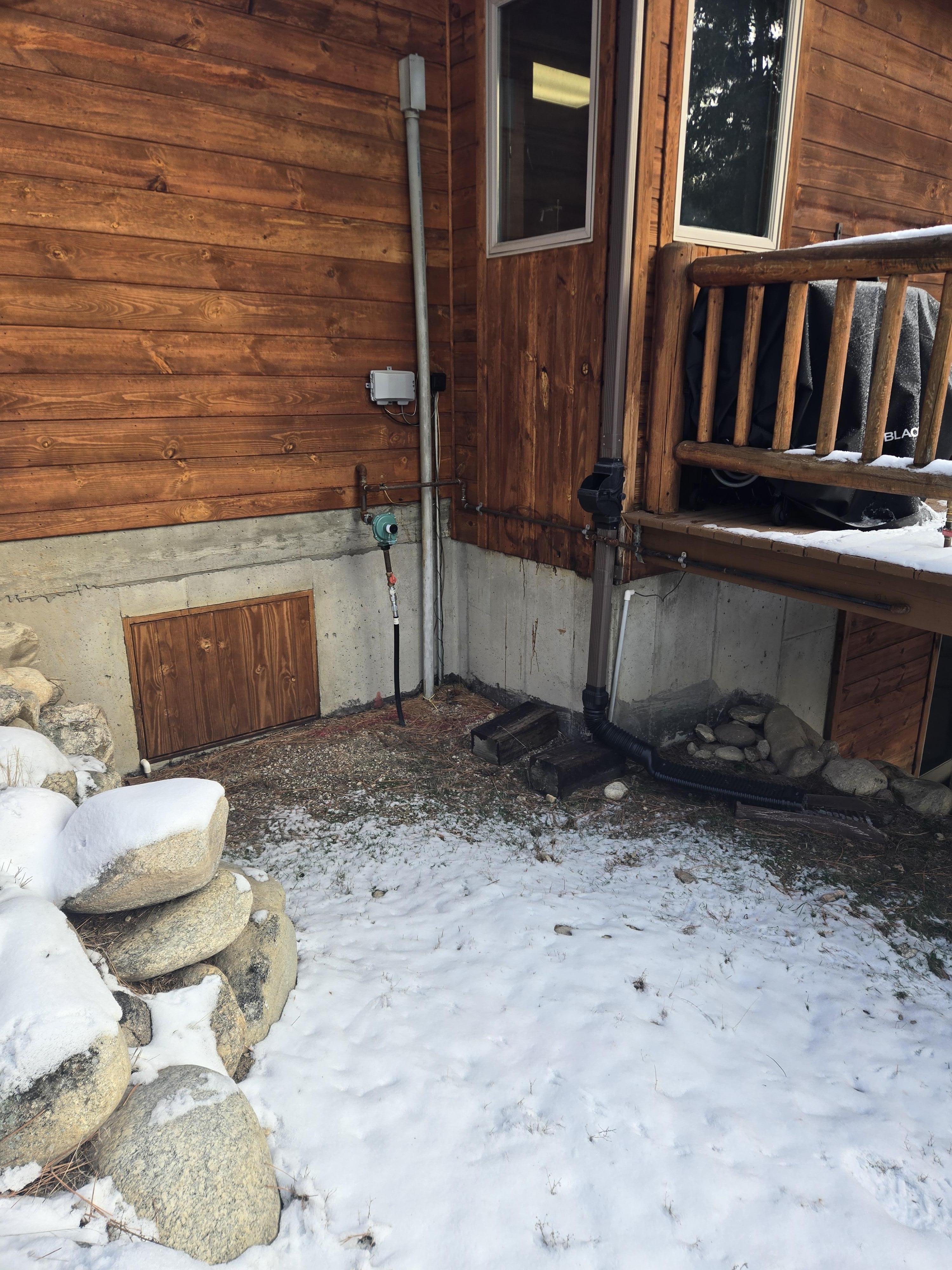 Exterior view of a house foundation and deck in winter with snow, showing the area where exterior water damage was addressed or investigated.