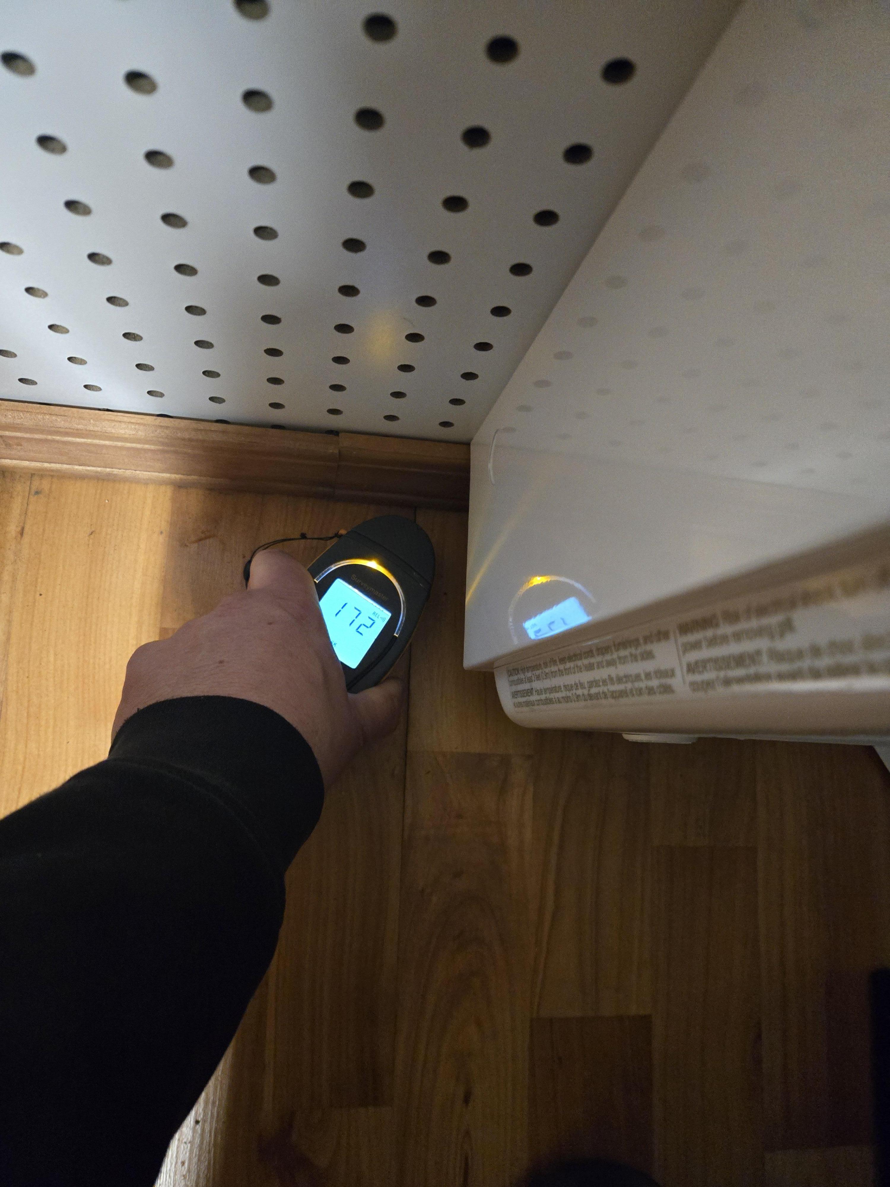 Hand holding a moisture meter showing a reading of 172, indicating severe water damage on a wooden surface under a shelf in a pantry or garage area.