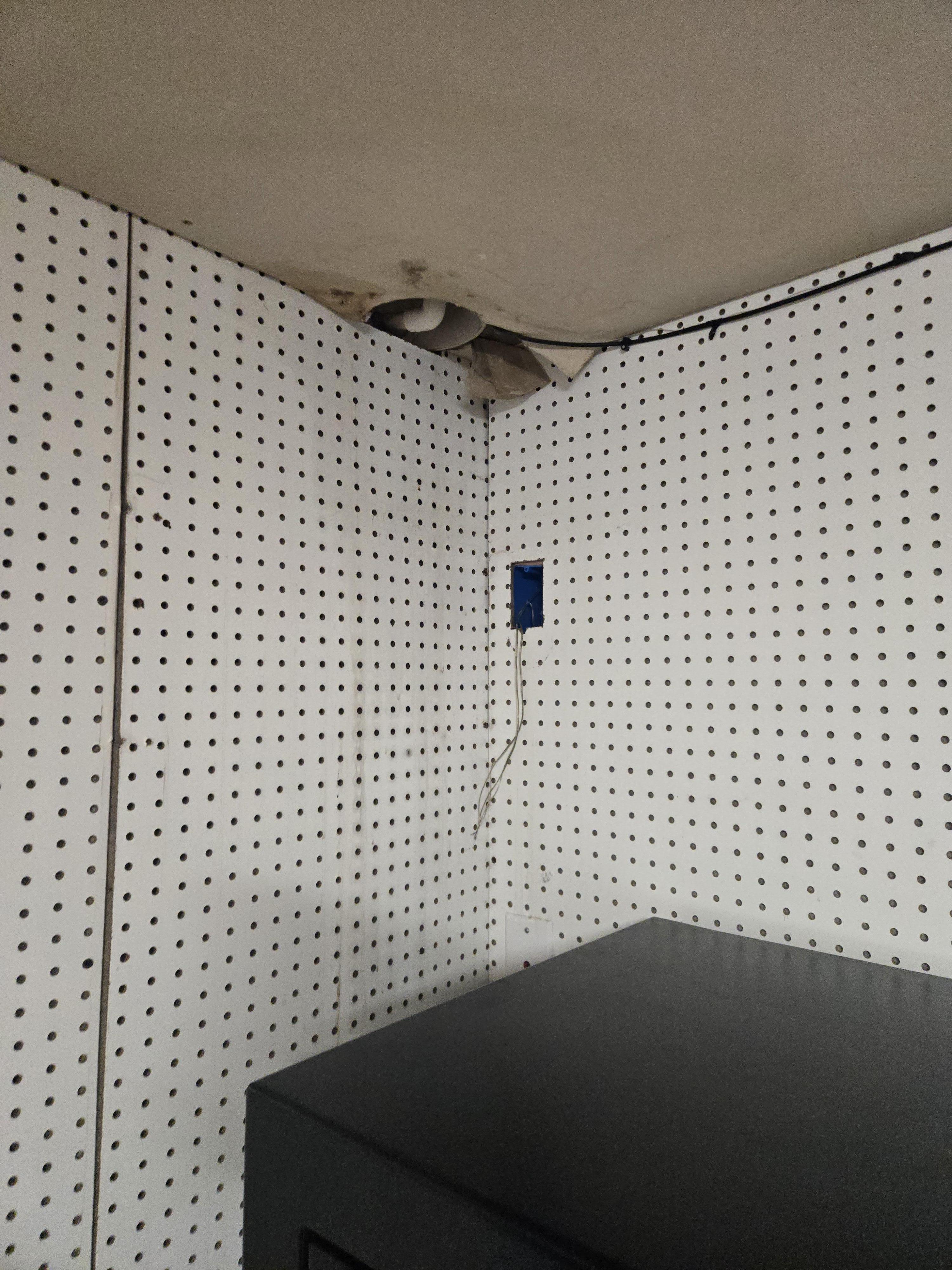 Visible water damage and mold growth in the corner where a ceiling meets a pegboard wall, likely in a pantry or garage, indicating the extent of the damage.