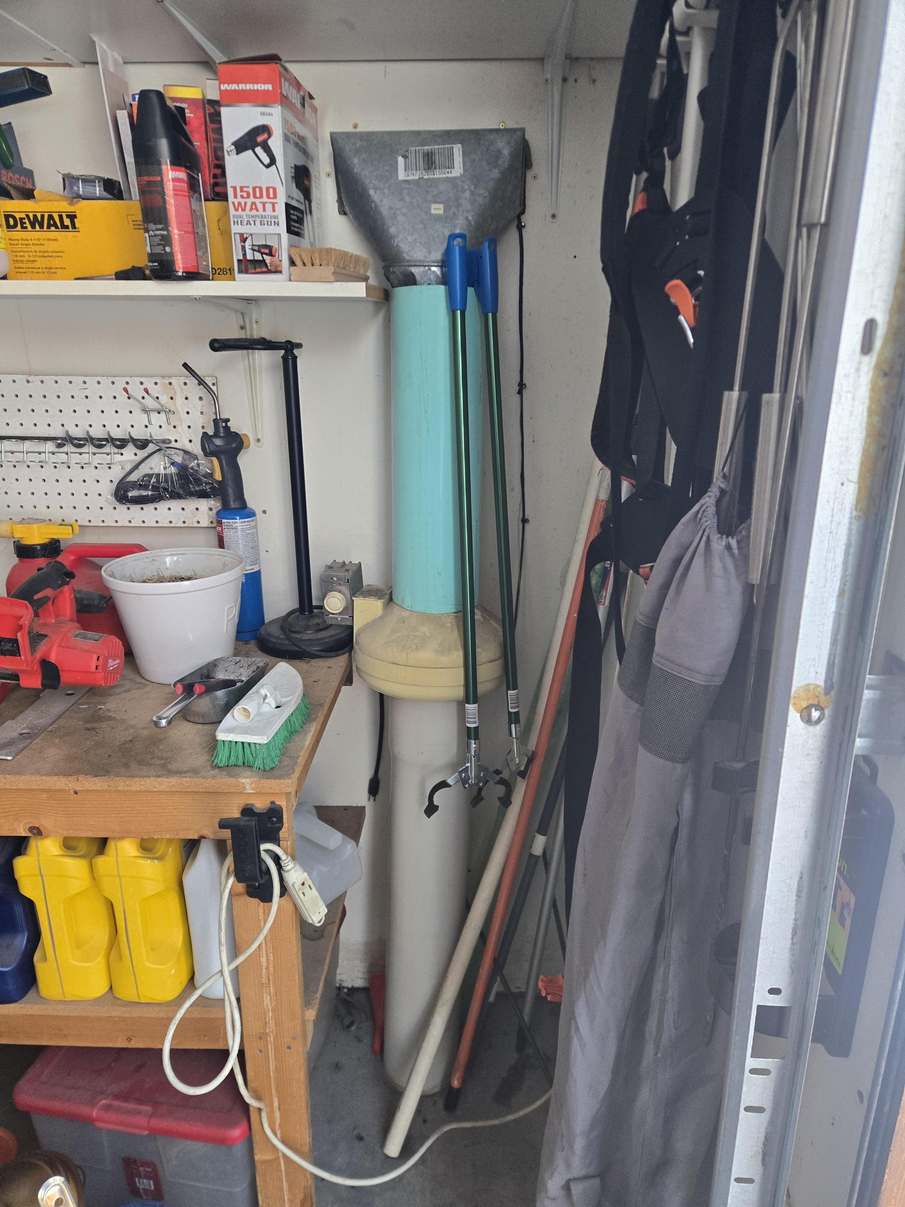Interior of a garage or utility room with shelves, tools, and equipment, demonstrating a clean and organized space post water damage restoration.