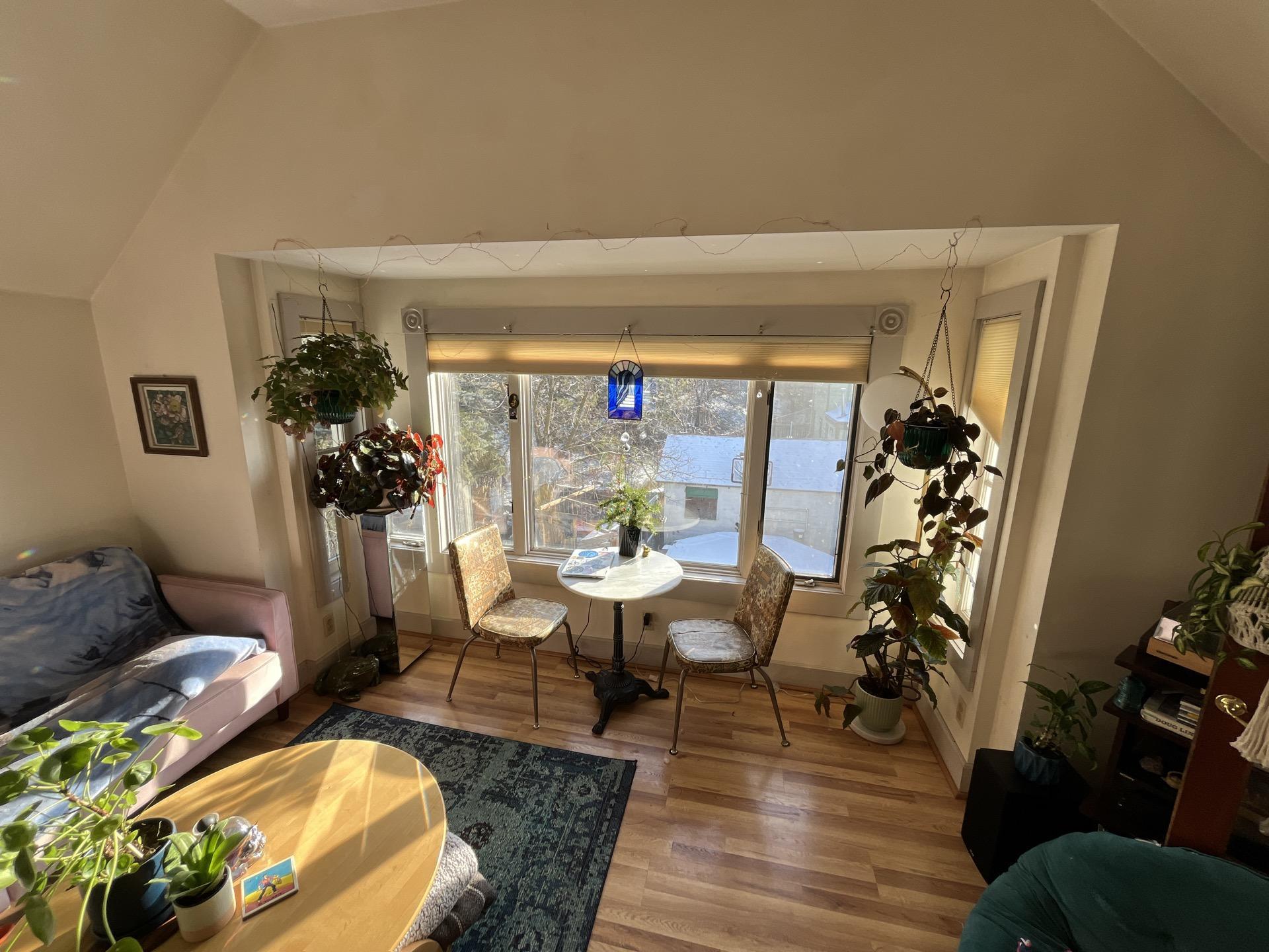 Bright Unit 1 living room or sunroom with large windows, indoor plants, and a small table, demonstrating a clean area post-restoration by Dayspring Restoration.
