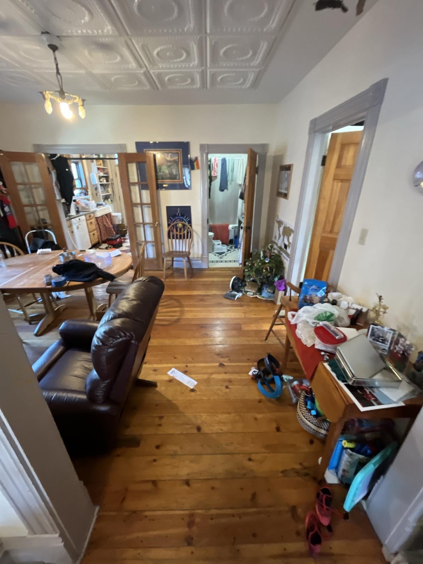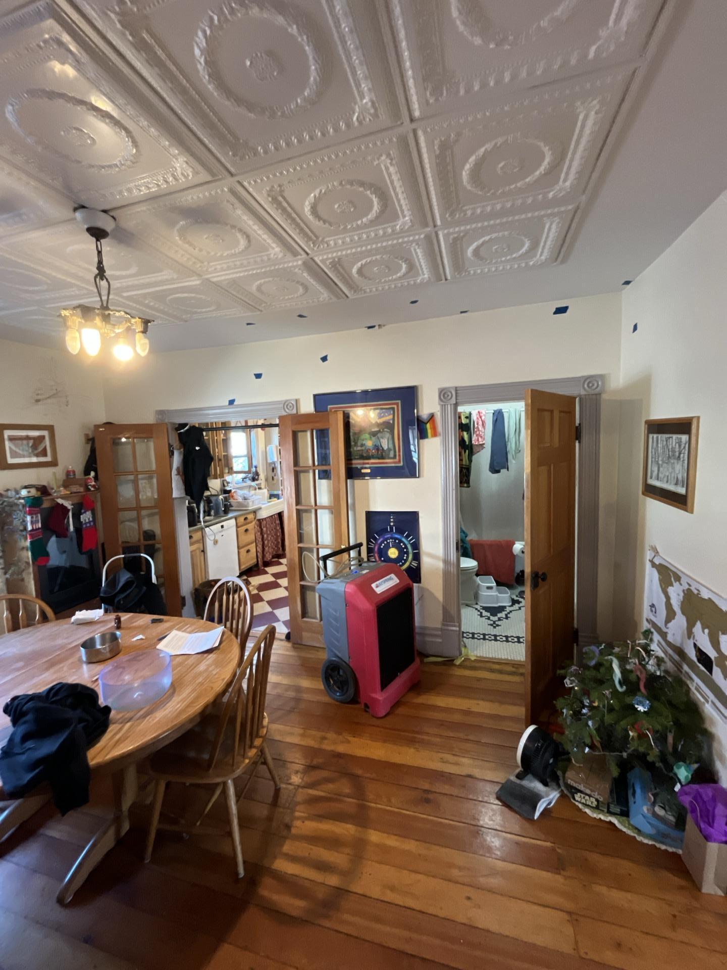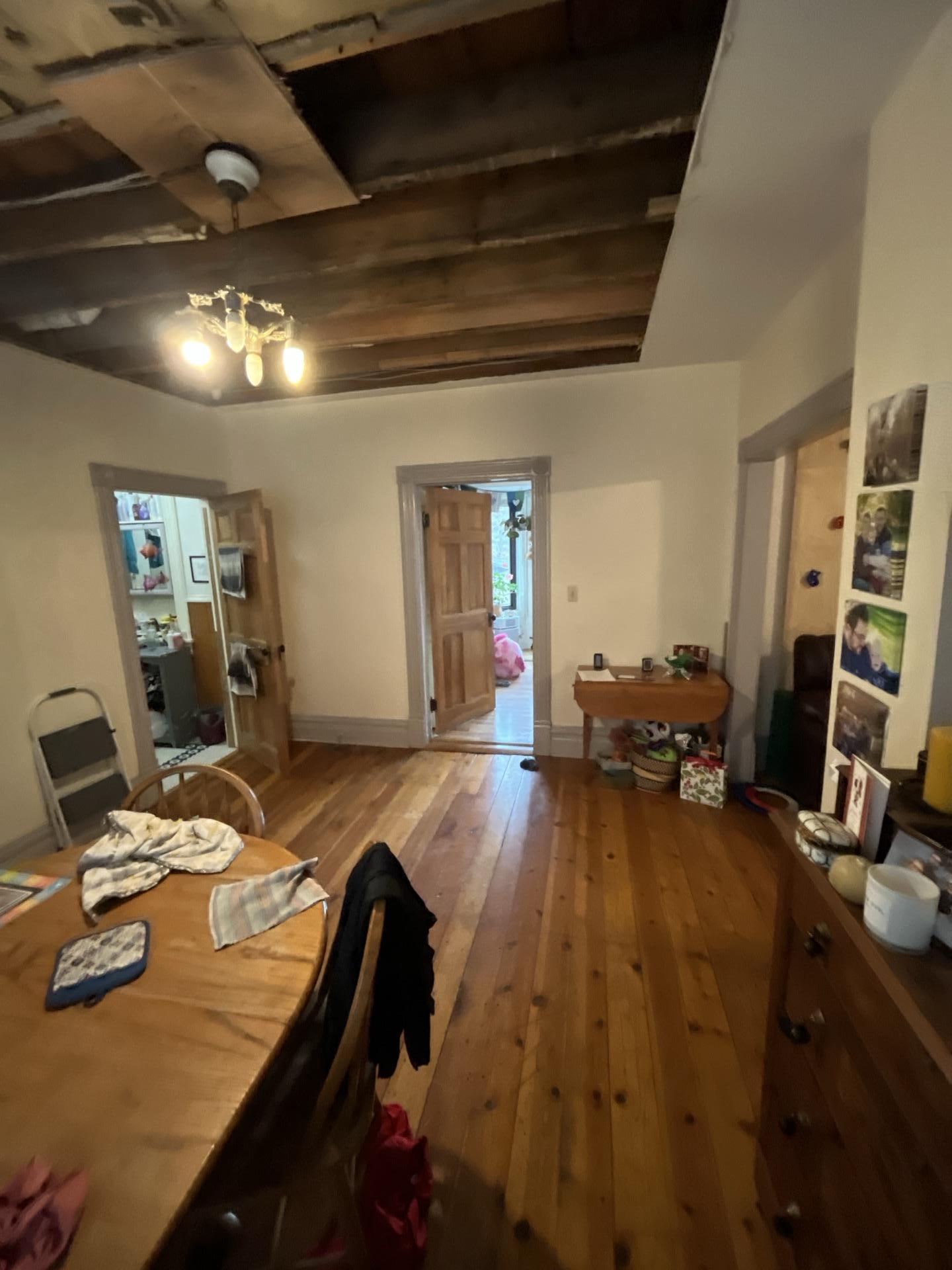 Exposed wooden ceiling in the Unit 1 dining room, revealing necessary demolition work undertaken by Dayspring Restoration to access and remediate moisture damage.