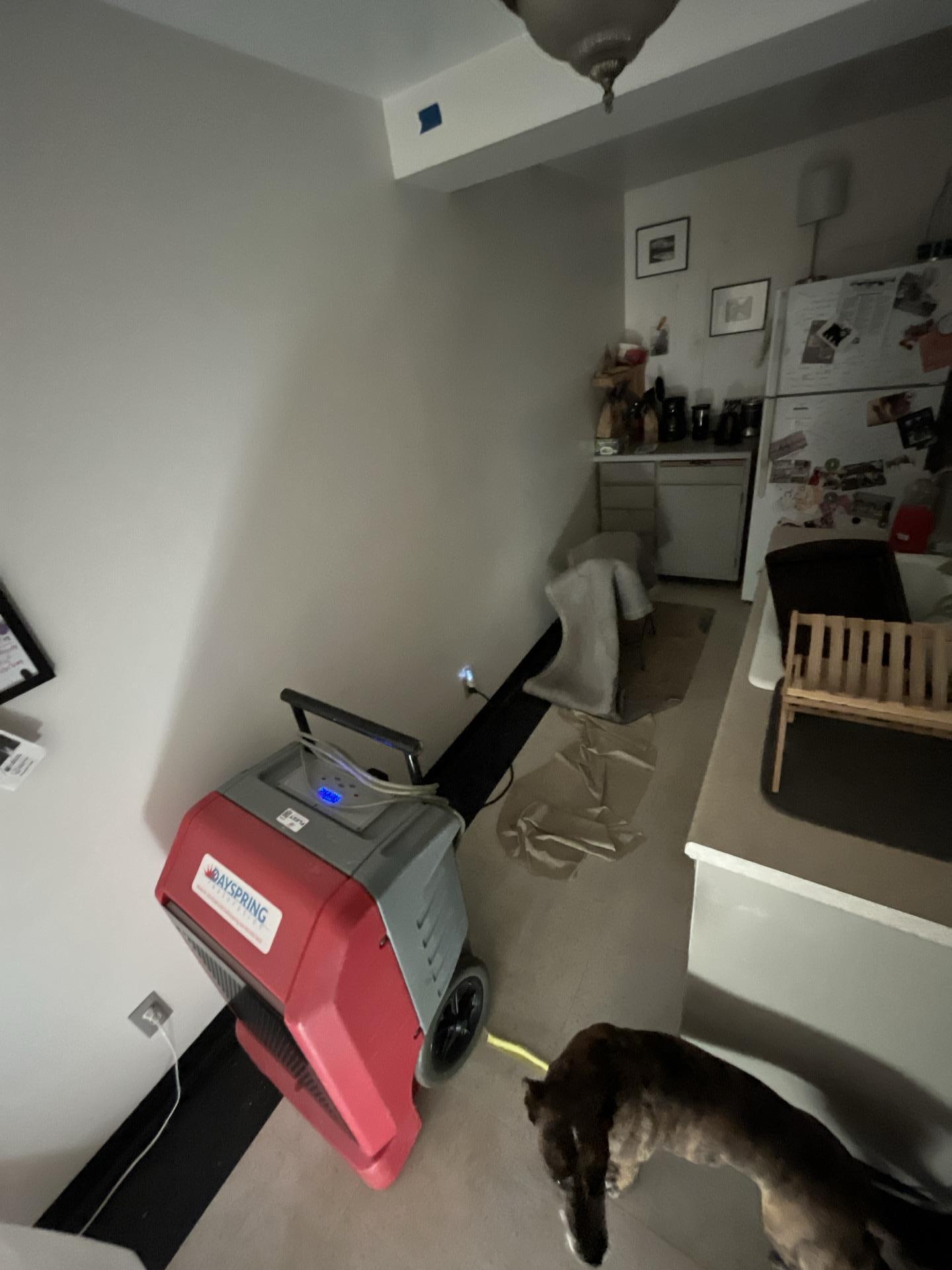 A DaySpring dehumidifier actively drying a kitchen area, demonstrating the use of professional equipment by Dayspring Restoration for effective moisture removal.
