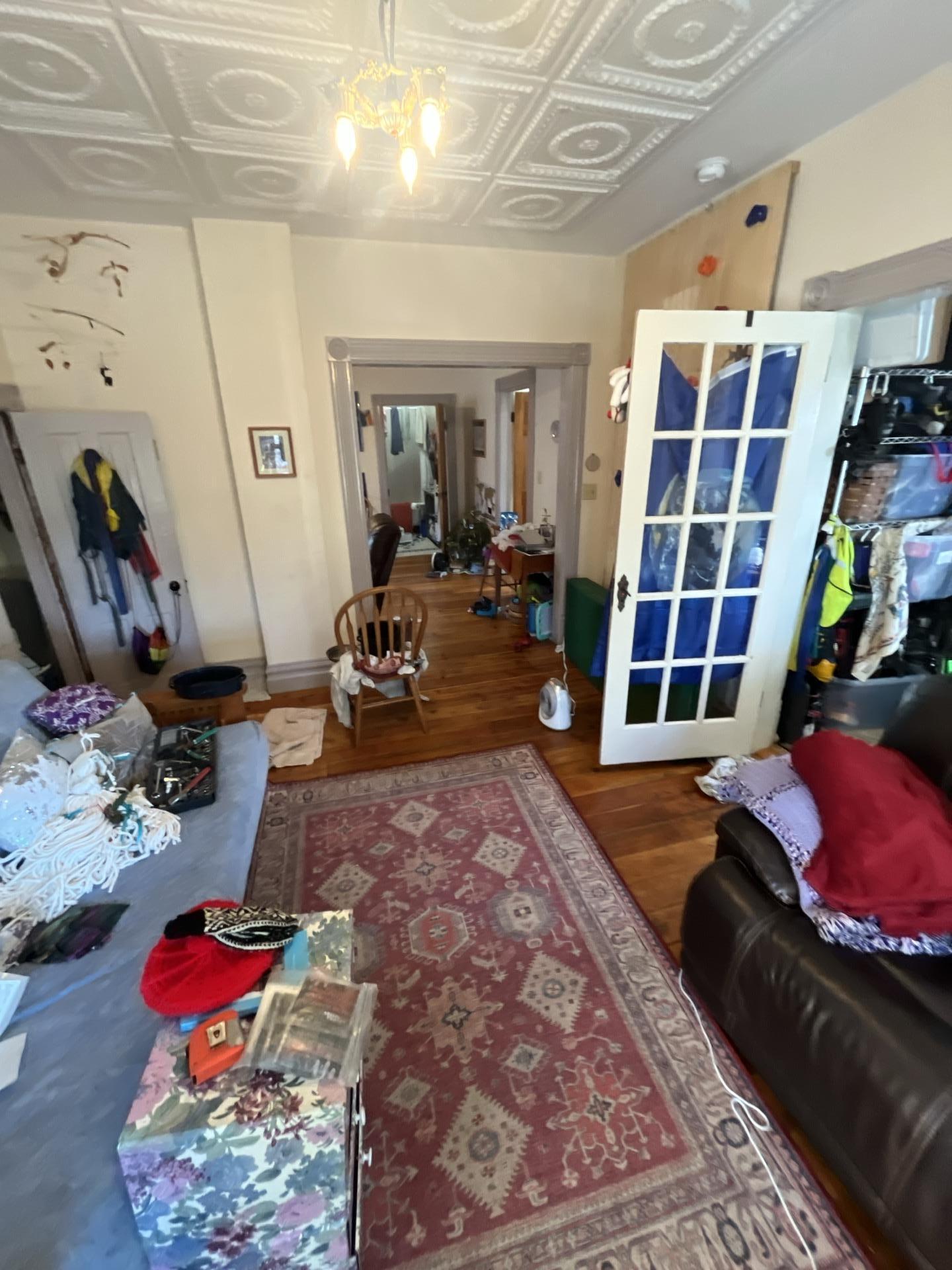 Wide angle view of a Unit 1 living room with polished wooden floors, a large rug, and various furnishings, representing a successfully restored area by Dayspring Restoration.