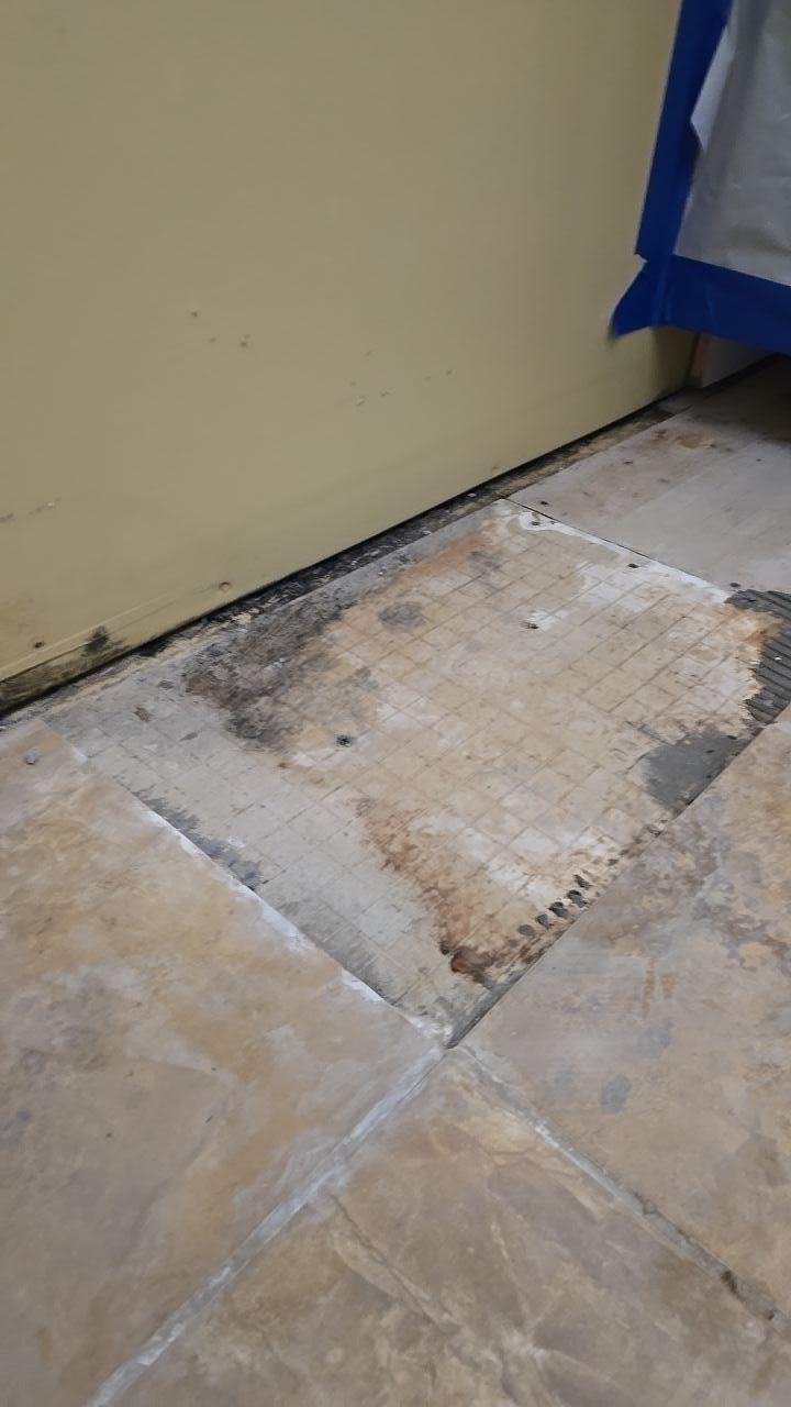 Exposed subfloor showing water stains and mold after damaged floor tiles were removed during water damage restoration.