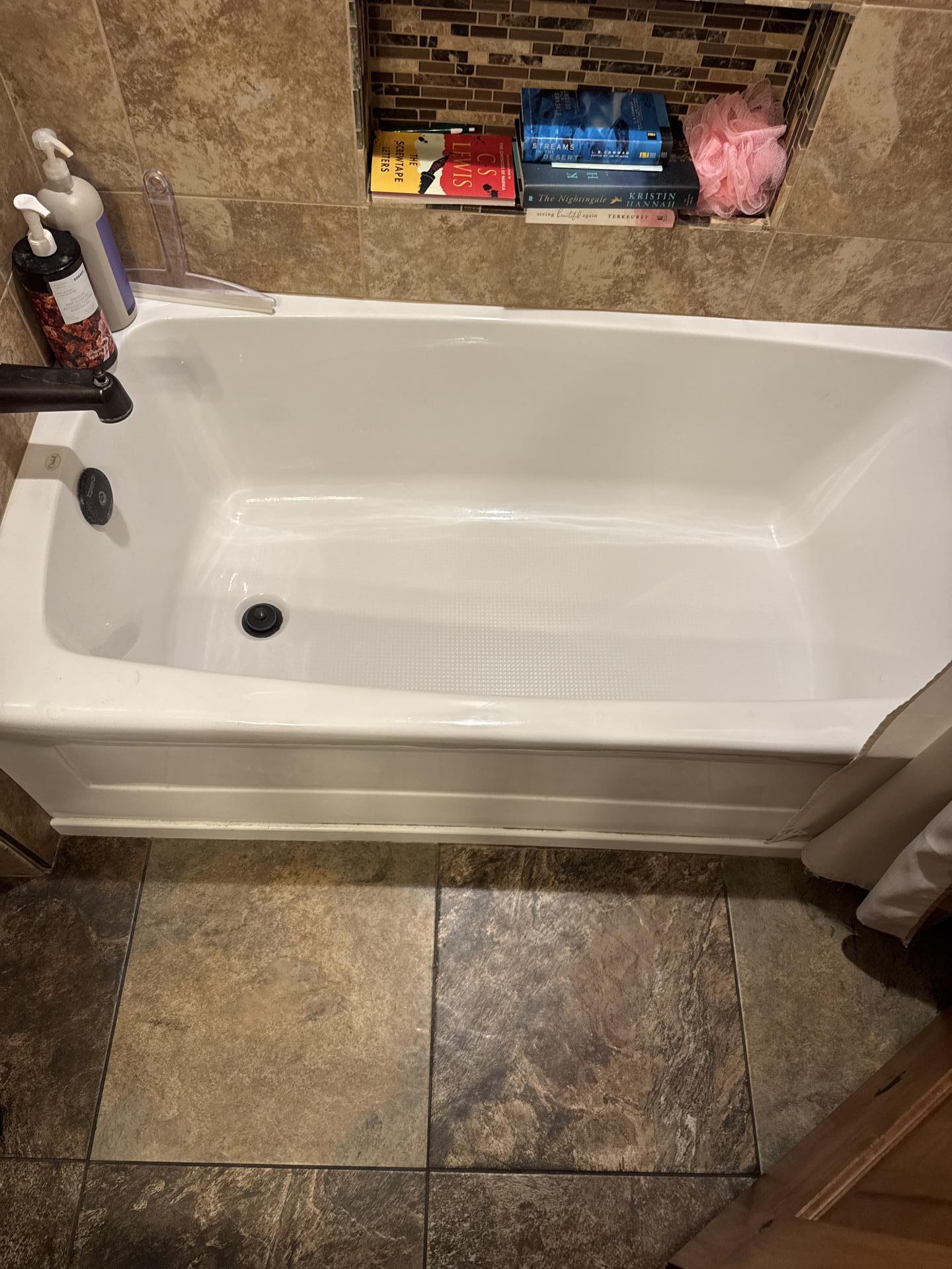 Clean white bathtub with brown tiled floor and a tiled wall niche, potentially an area inspected for water damage