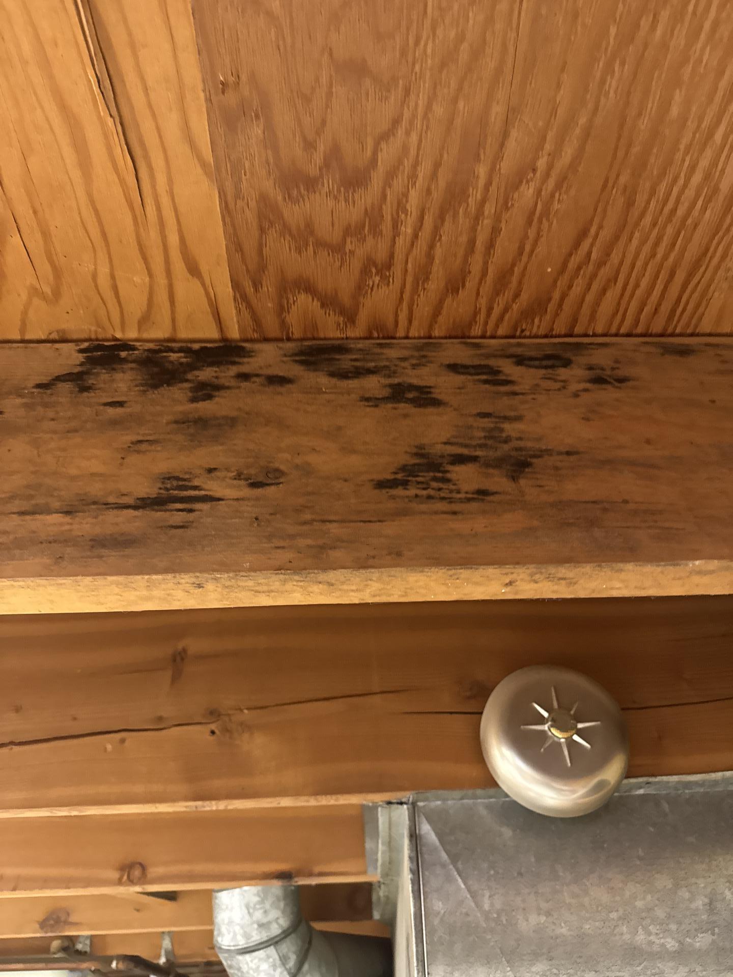 The customer experienced water damage in their home, leading to visible black mold growth on wooden joists in the basement and along a baseboard in a bathroom area, indicating a need for professional water damage and mold remediation services.