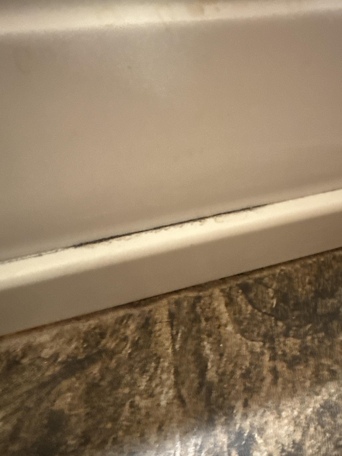 Close-up of black mold or mildew growth along a bathroom baseboard or caulk line, indicating water damage