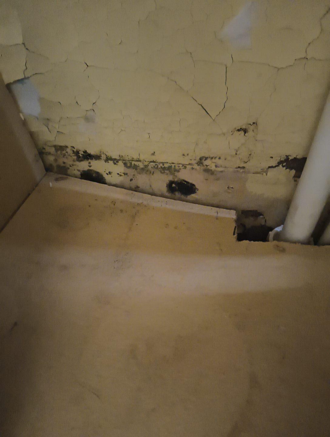 The customer experienced significant mold growth within their property, specifically in areas such as a utility room or laundry area, and extending into structural elements like wooden joists and potentially the basement or crawl space. The mold was visible on walls and structural materials, indicating moisture intrusion and an unhealthy indoor environment.