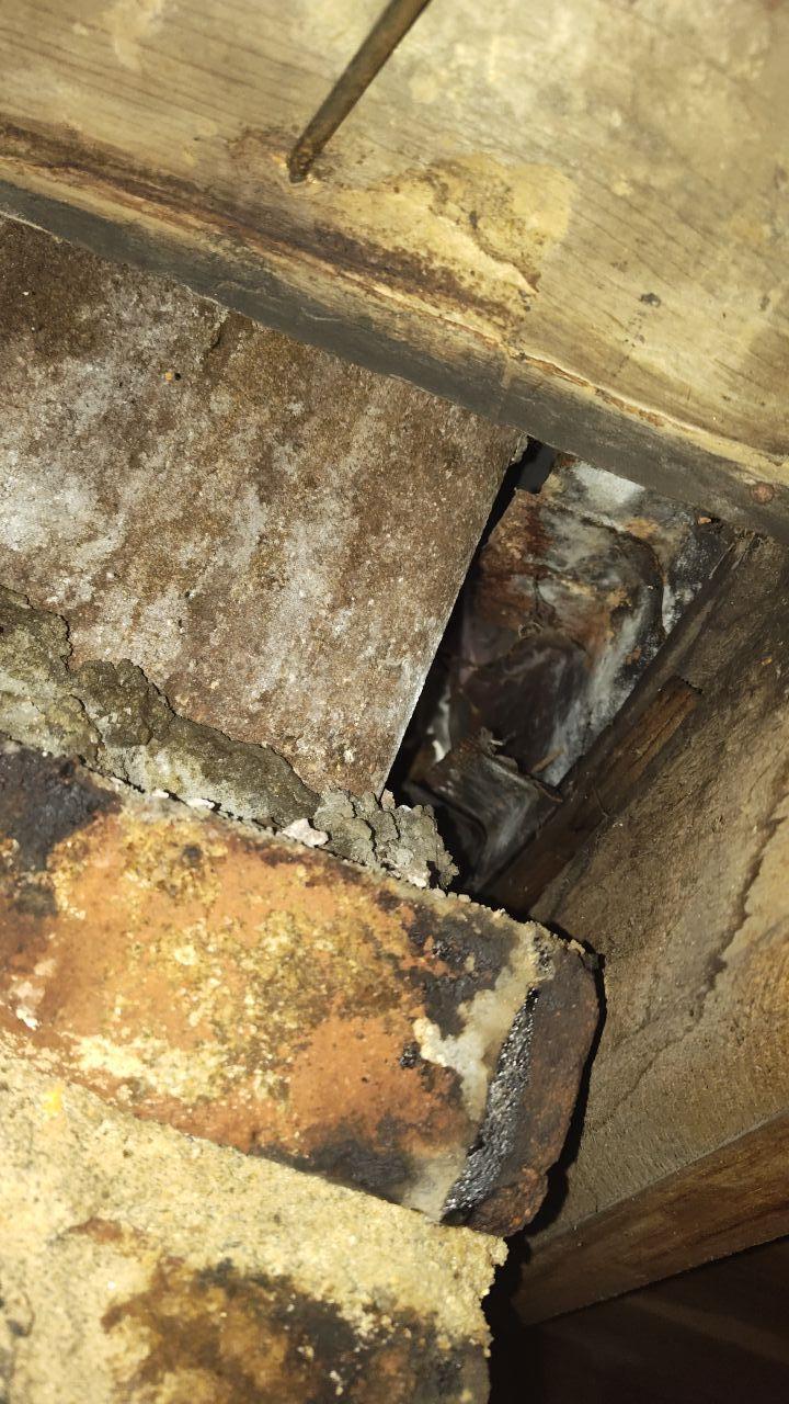 Detail of white and black mold growth on wooden joists and brick, demonstrating active fungal damage to structural components.