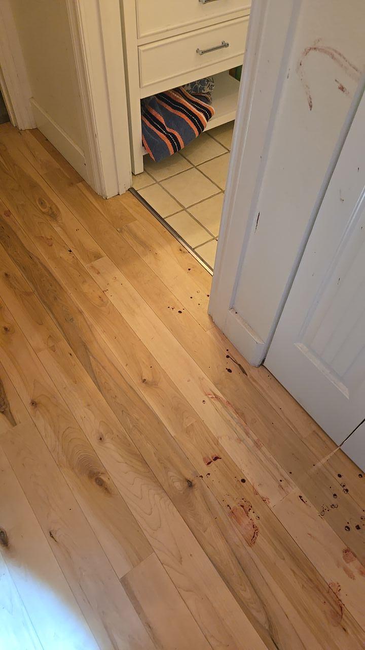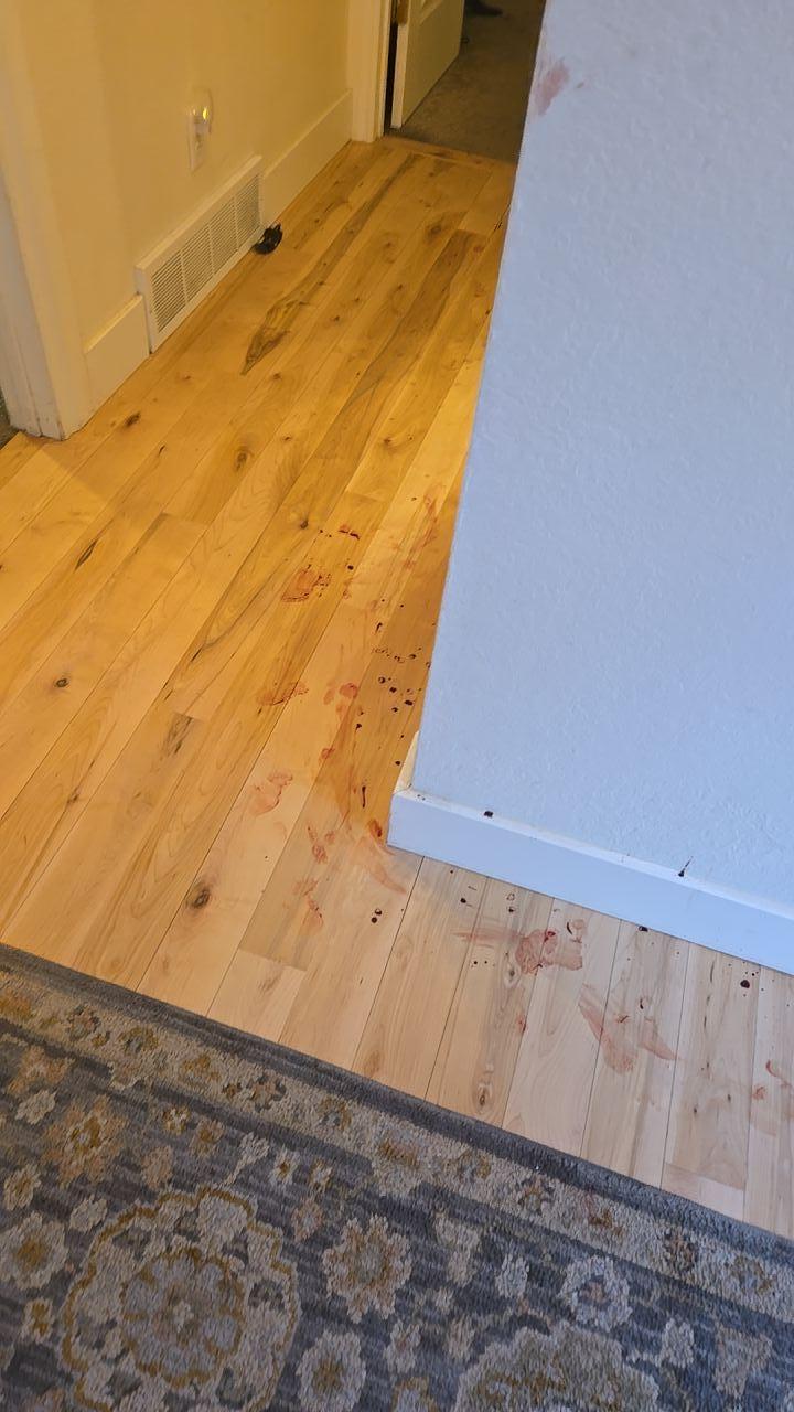 Extensive blood splatter on light hardwood flooring in an entryway, showing a critical biohazard cleanup need.