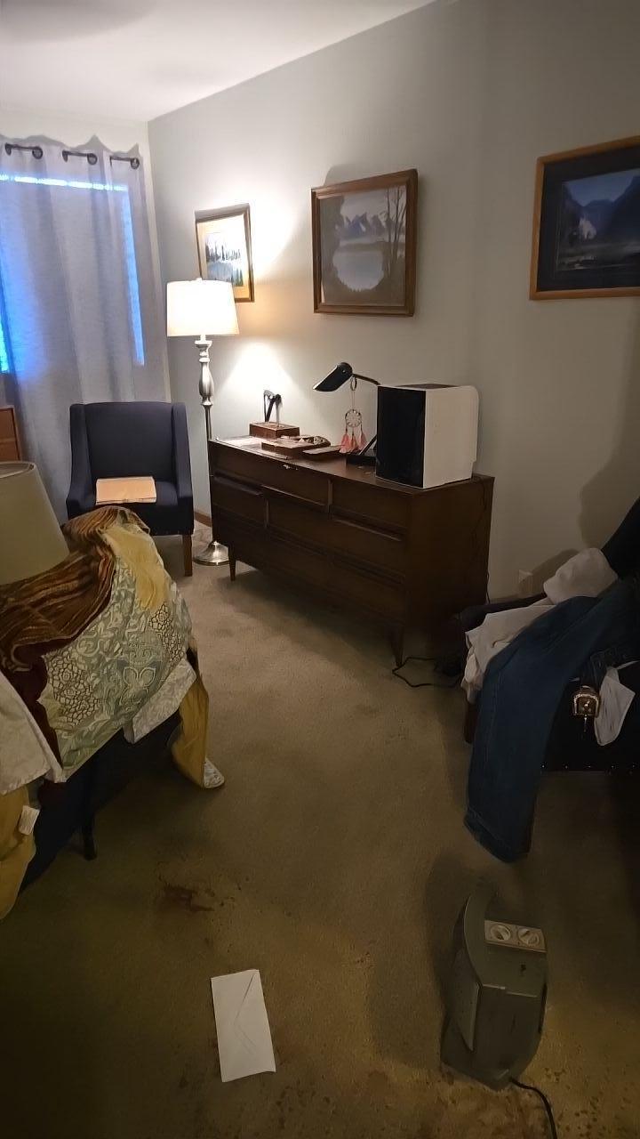 Overview of a residential room with a visible blood stain on beige carpet, prior to professional biohazard cleanup services.