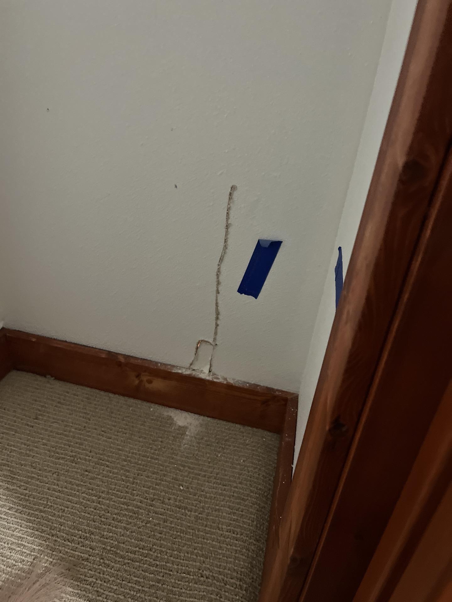 Close-up of a wall with blue tape and markings, likely indicating areas of moisture intrusion or structural monitoring points during the sewage and water damage drying process.