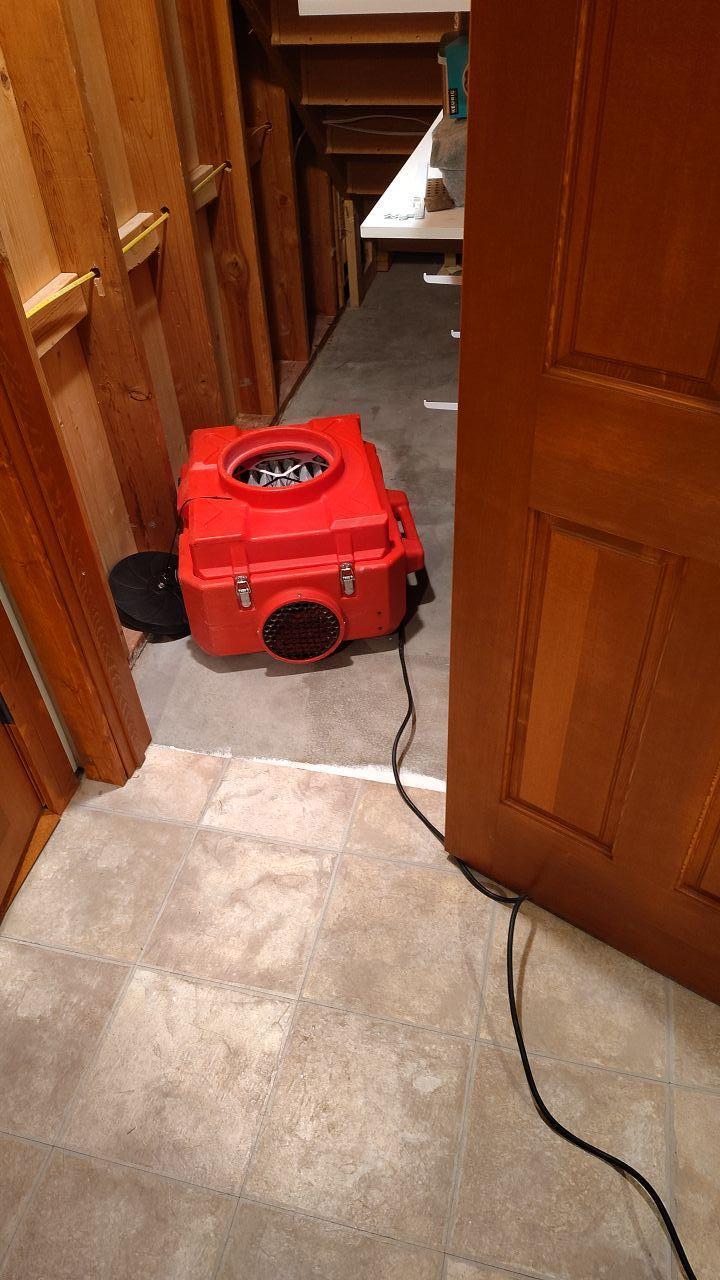 A red professional air mover positioned in a doorway, actively drying the floor during the post-sewage cleanup water damage restoration phase.