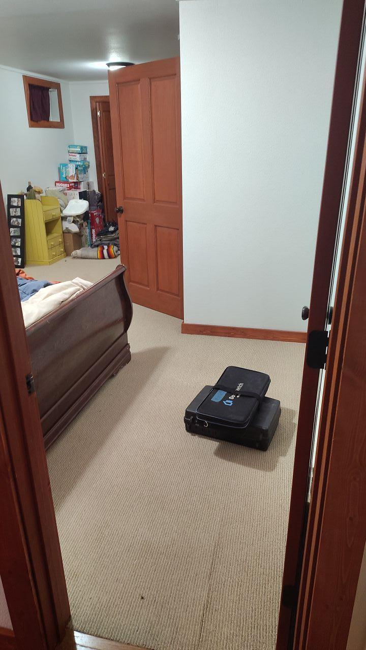 A clean and restored bedroom with carpet, adjacent to the affected bathroom, showcasing the successful remediation and drying efforts after sewage cleanup.