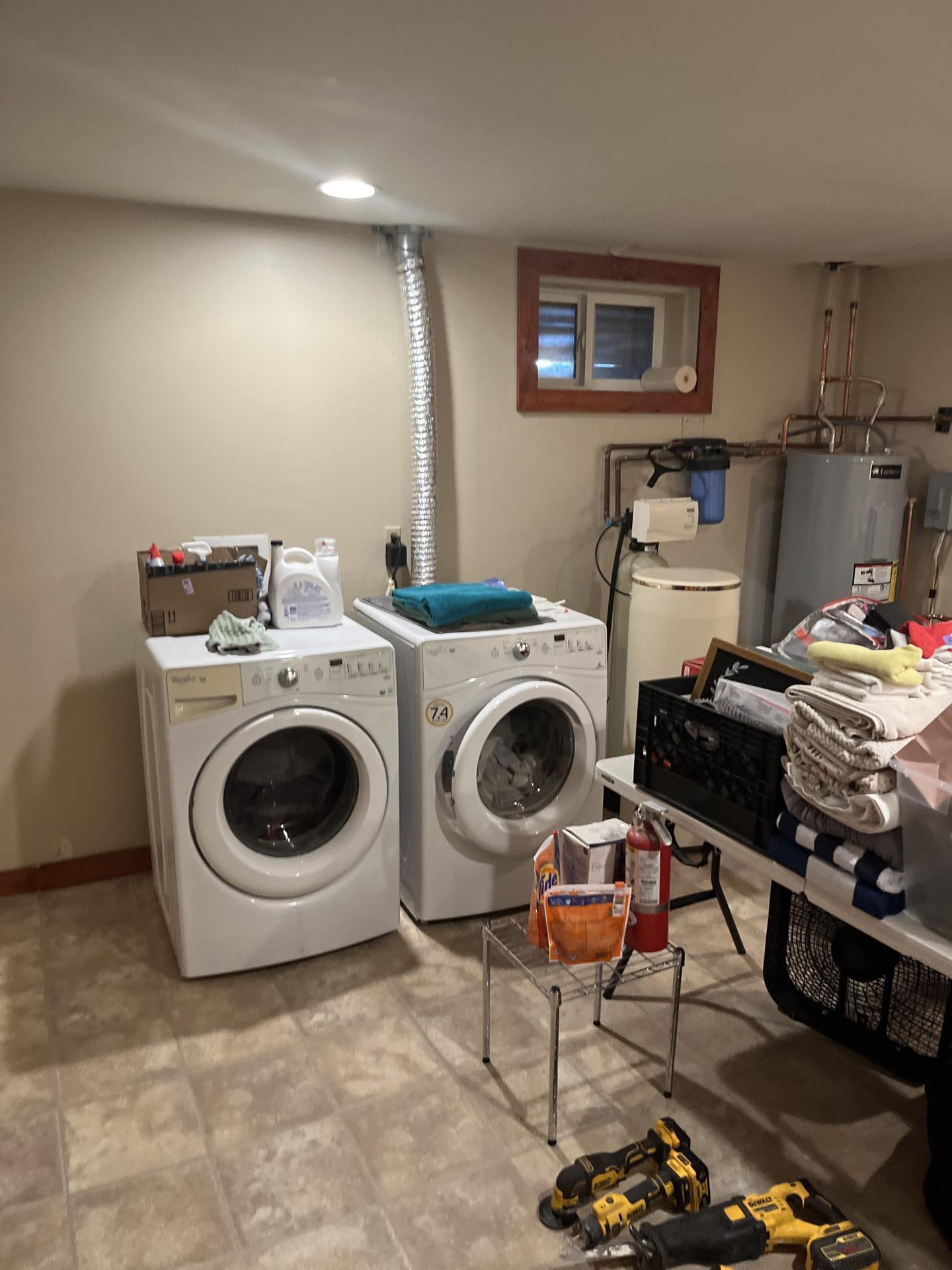 A laundry room with a washer and dryer, possibly the source or an indirectly affected area related to the sewage backup, inspected during the cleanup process.