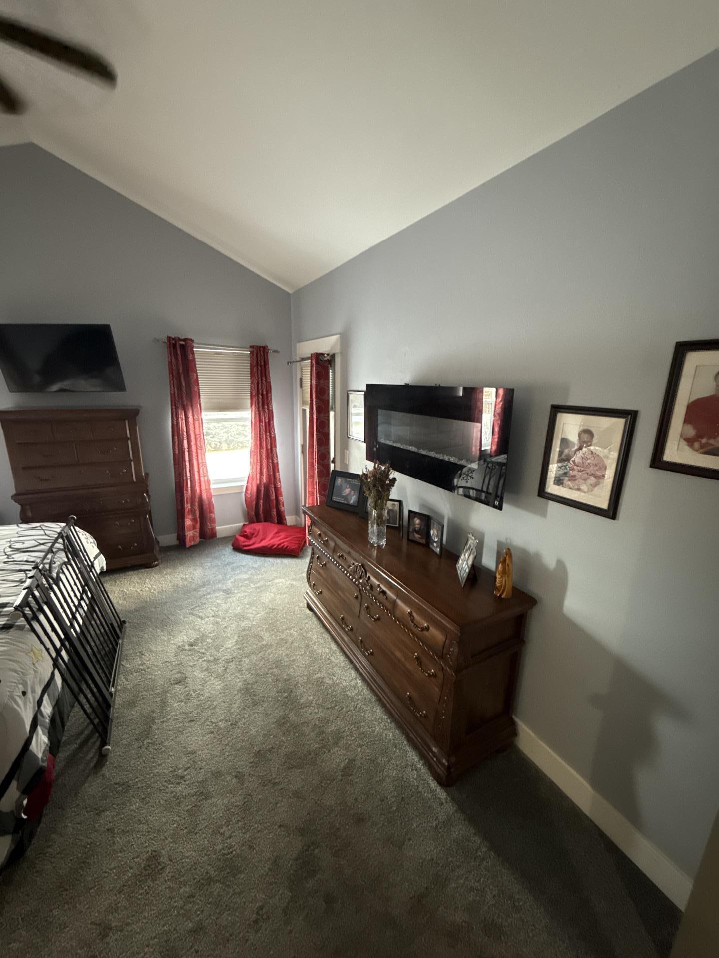 Modern bedroom with grey walls, plush carpet, a wooden dresser, and a wall-mounted electric fireplace, representing a successfully restored space after water damage.