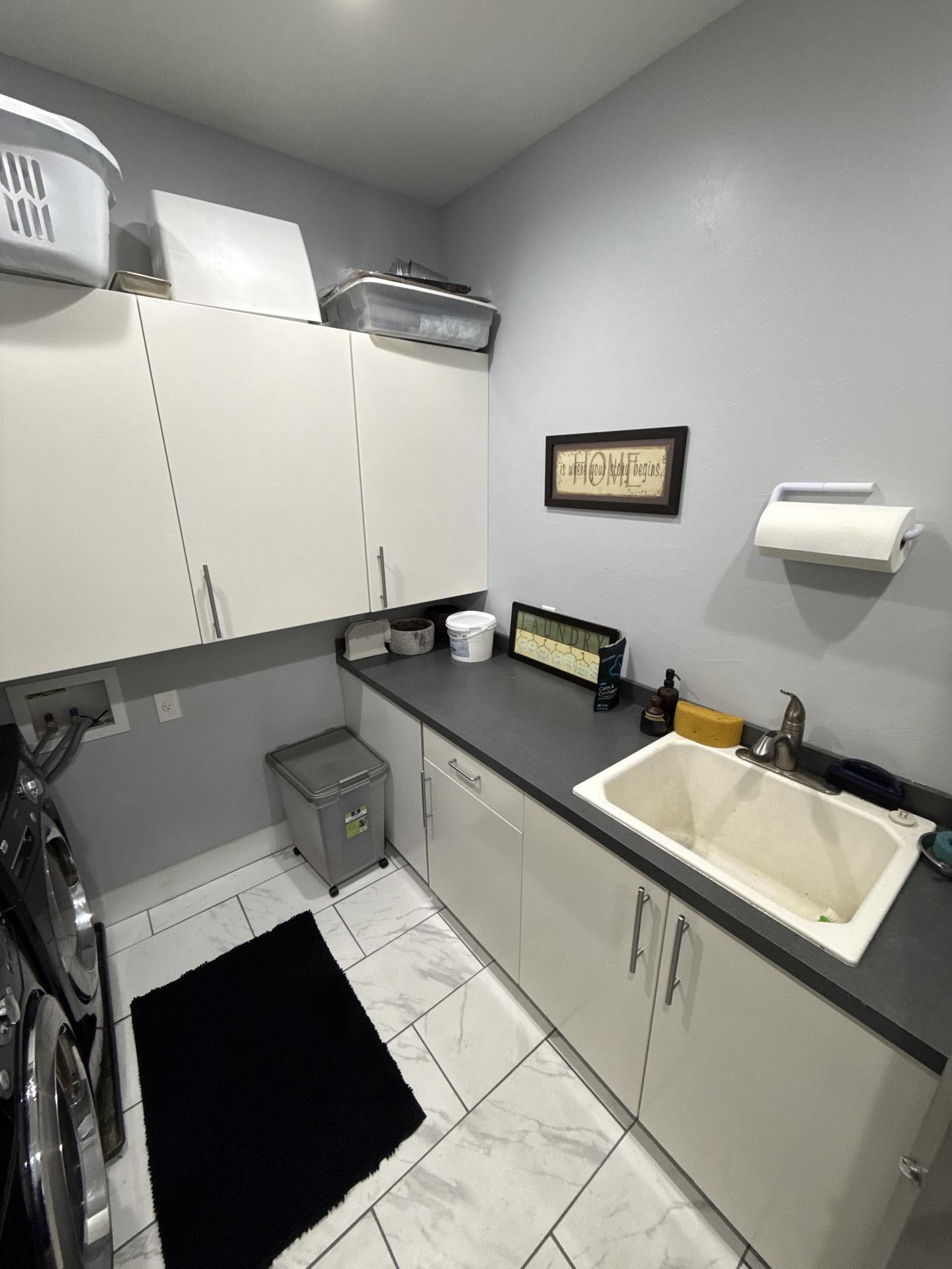 Clean and organized laundry room featuring white cabinetry, a utility sink, washing machine, and dryer, showcasing the completed water damage restoration.