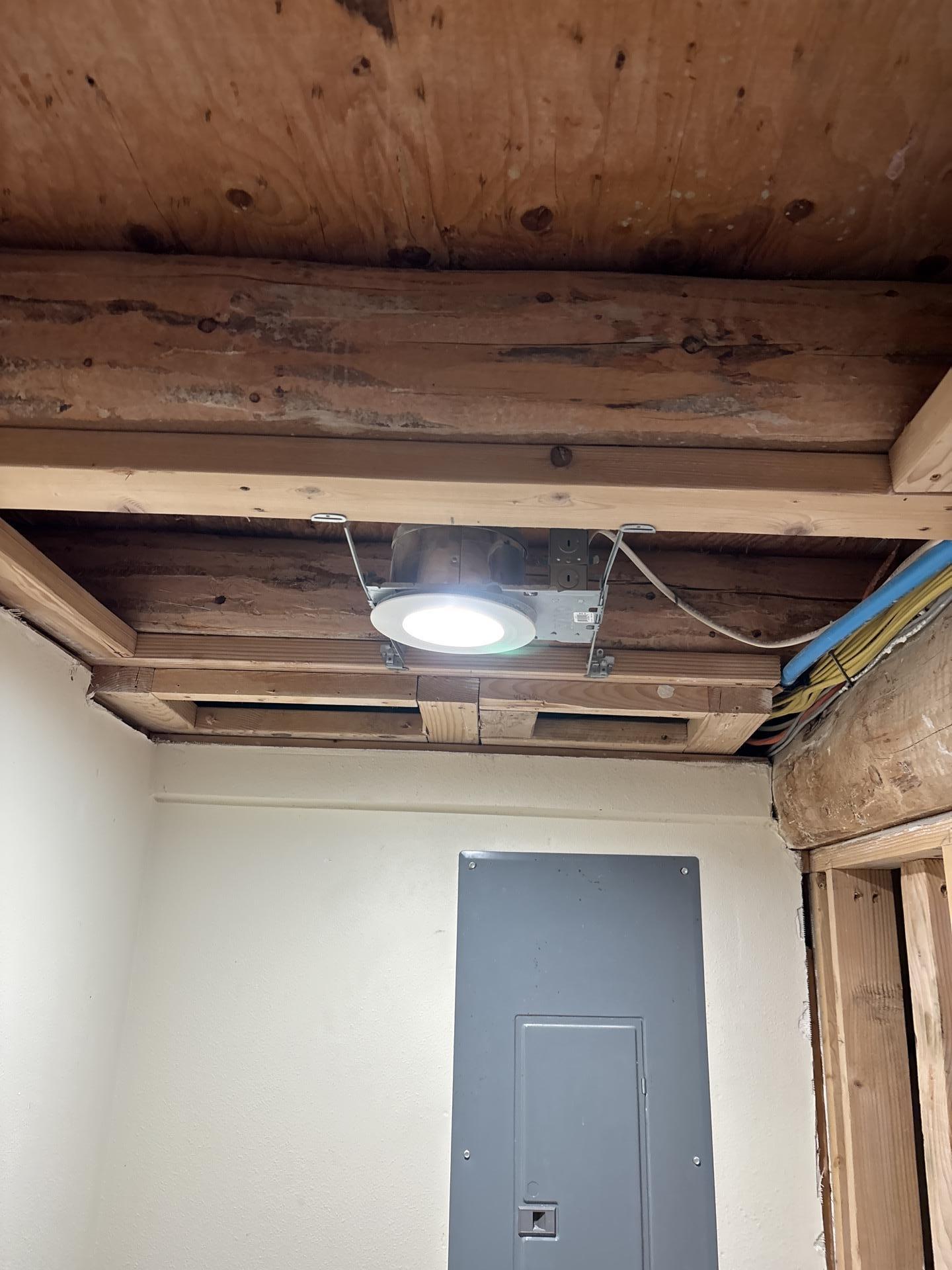 View of a partially unfinished or restored ceiling with exposed wooden beams, a newly installed recessed light, and electrical wiring, indicating ongoing water damage repair or assessment.