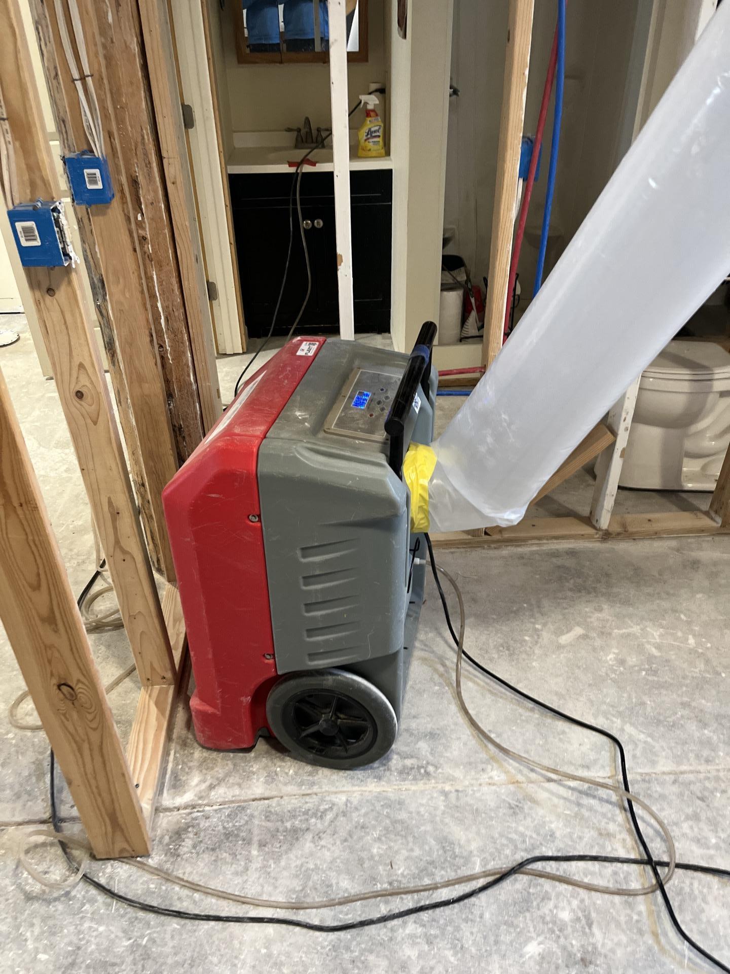 A red and grey commercial dehumidifier with an attached air duct actively drying a room, showing exposed wall studs, plumbing pipes, and electrical wiring during water damage remediation.
