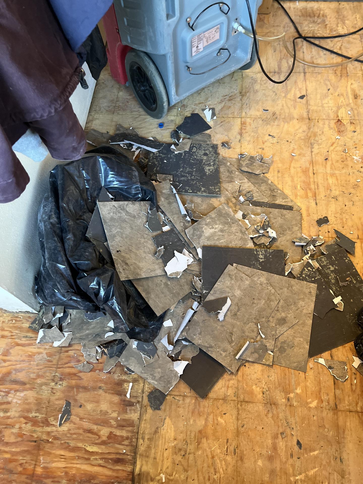 Pile of removed water-damaged floor tiles and linoleum pieces on a wooden subfloor, next to a black trash bag, with a commercial dehumidifier partially visible in the background for drying.