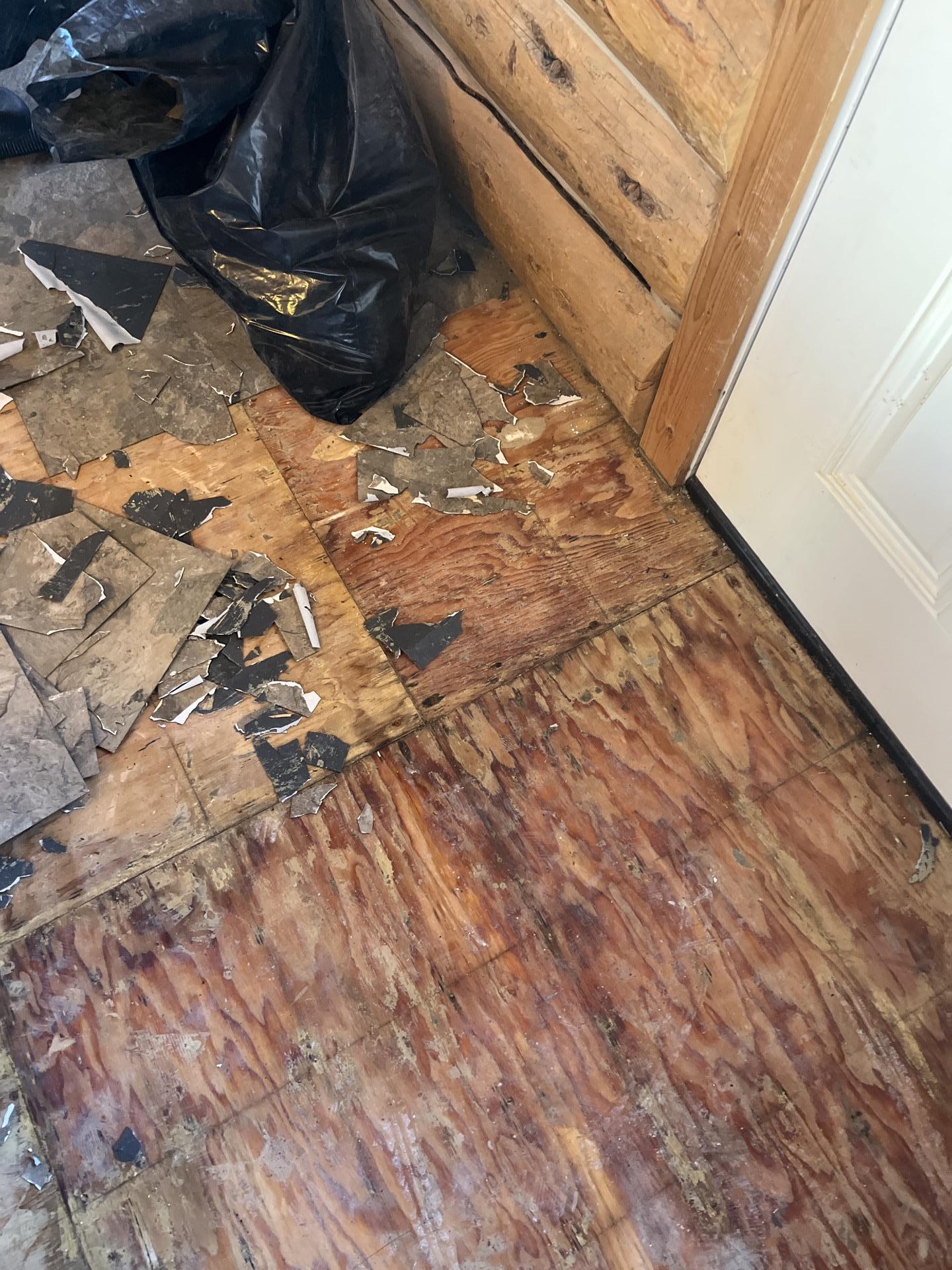 Water damaged floor showing peeled-off vinyl tiles and linoleum debris on a wooden subfloor, with a black trash bag containing removed materials, during water damage cleanup.
