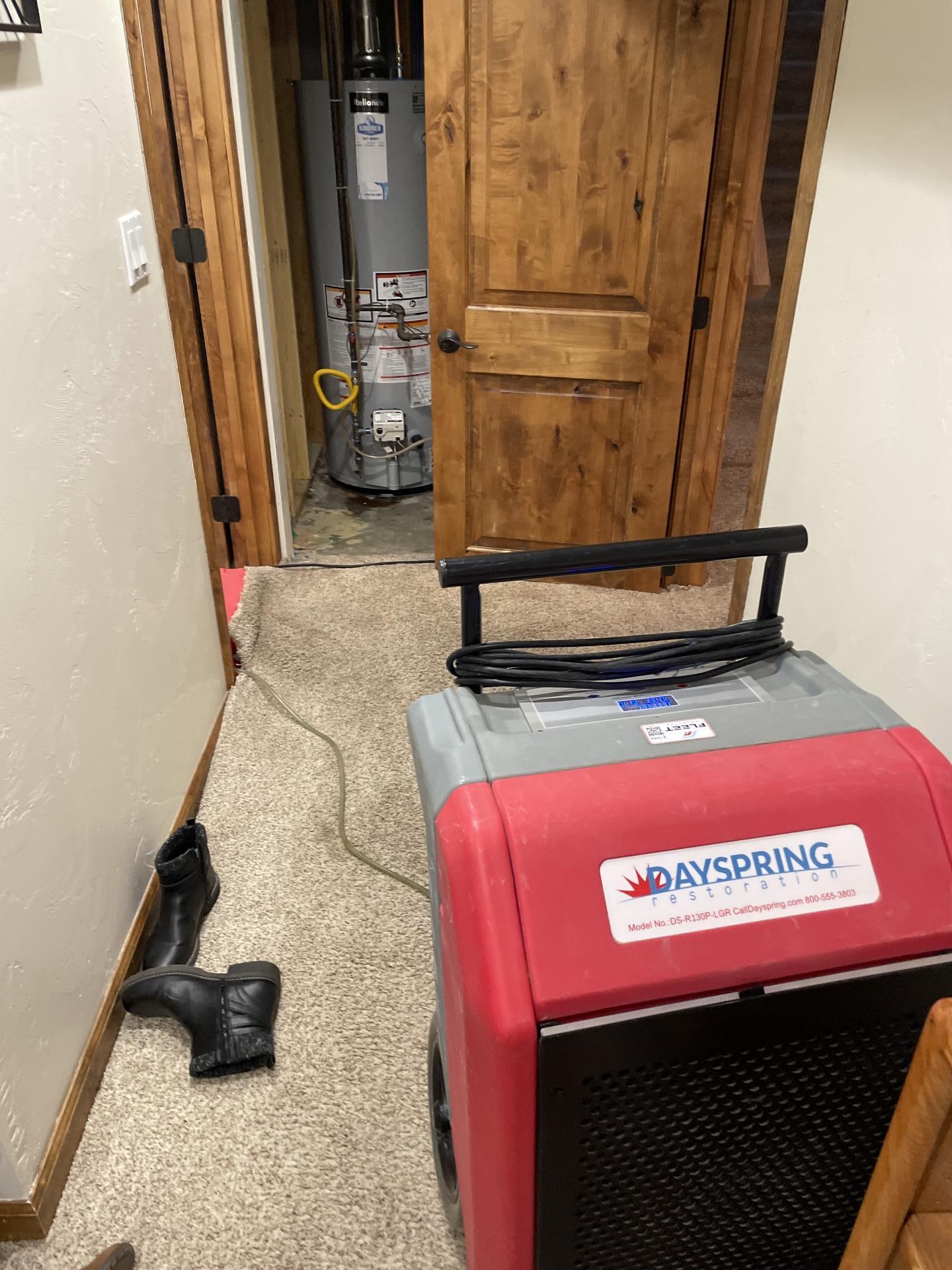 A hallway with a Dayspring Restoration commercial dehumidifier actively drying the carpet, with an open door revealing a utility closet containing a water heater, indicating water damage source or affected area.
