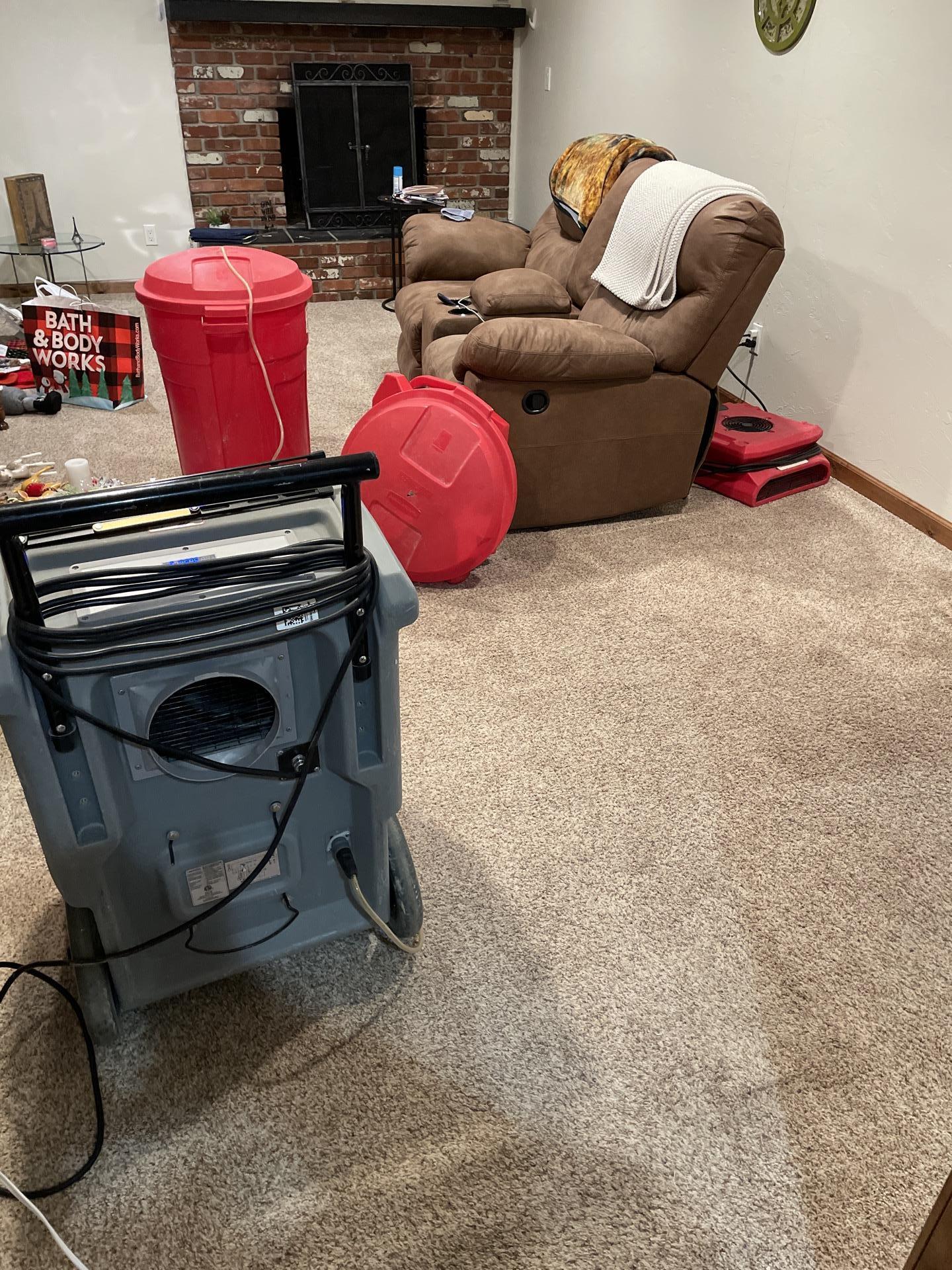 Dayspring Restoration deployed professional water damage restoration equipment, including industrial air movers and dehumidifiers, to extract water, dry affected areas, and mitigate further moisture damage. The restoration process targeted both hard flooring in utility spaces and carpeted living areas to ensure thorough drying.