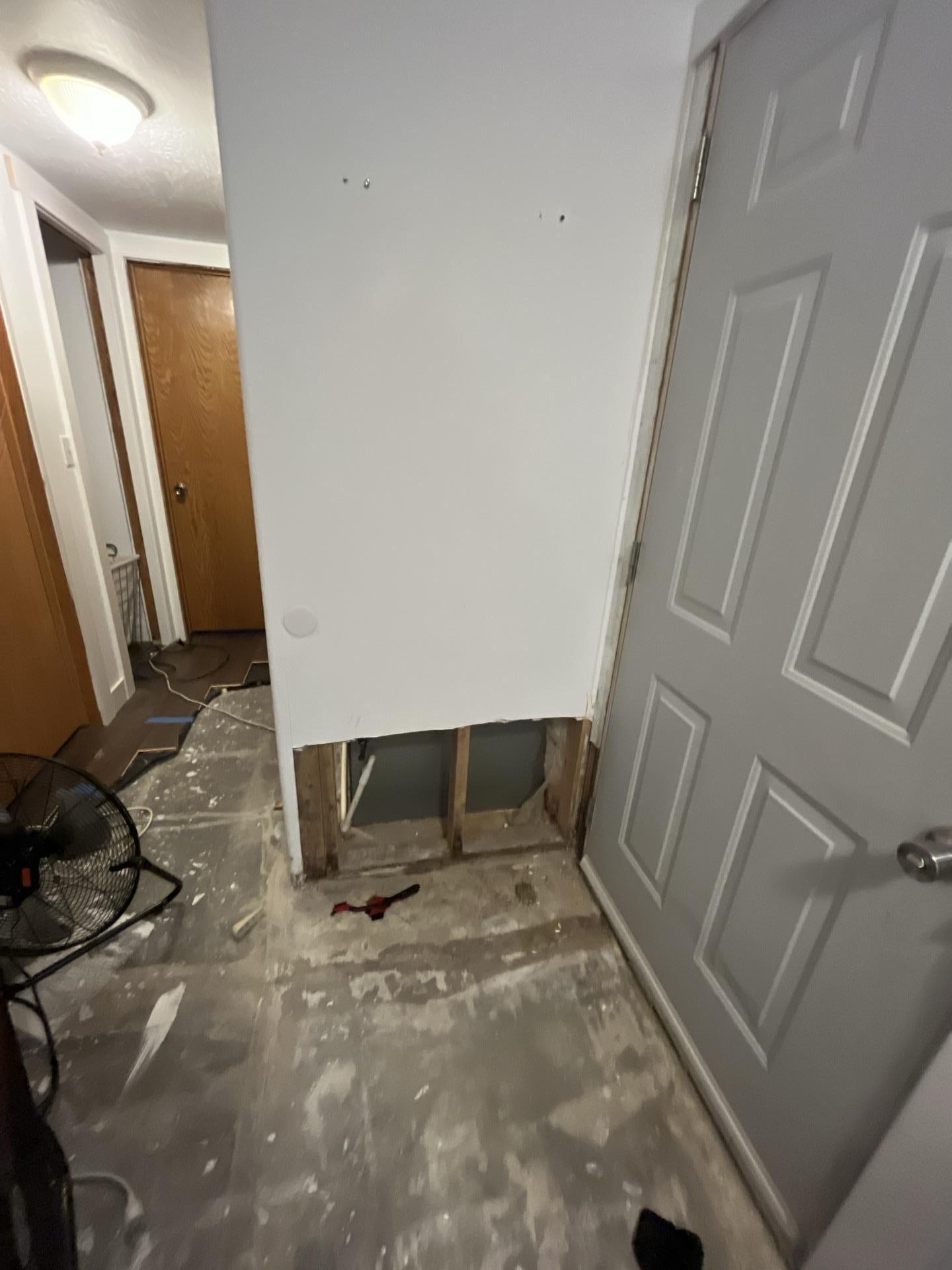 Overview of a hallway undergoing water damage restoration, with a section of the wall removed, exposed framing, and a drying fan actively running to mitigate moisture.