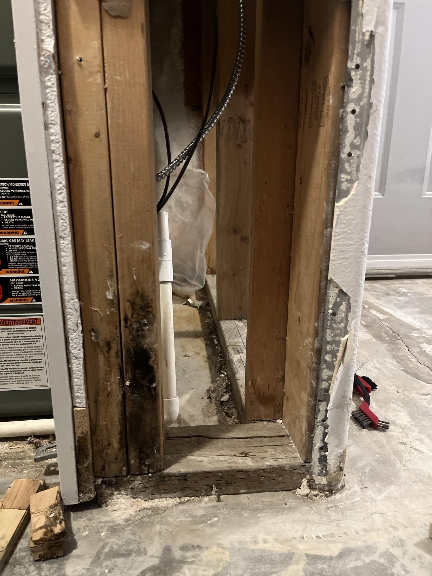 The customer experienced significant water damage in their property, leading to visible mold growth on wall framing and subfloor deterioration.