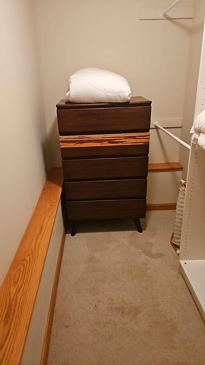 Interior view of a carpeted closet with a dark wooden dresser and potential water stains on the floor, suggesting water intrusion in a bedroom area.