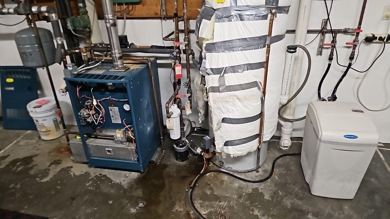 Overview of a utility room featuring a furnace, water heater wrapped in insulation, pipes, and a water softener, with visible water on the concrete floor from a leak.