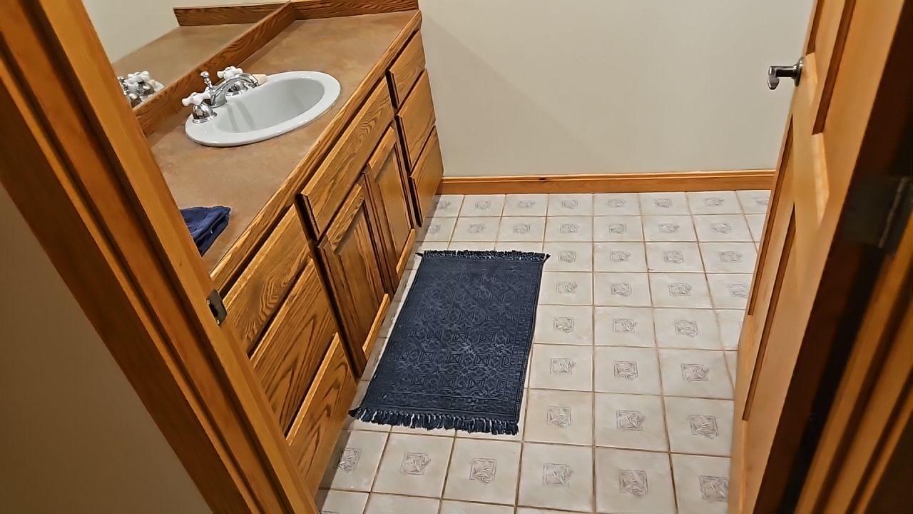 View of a bathroom with a wood vanity, white sink, and tiled floor, indicating an area included in the water damage assessment.
