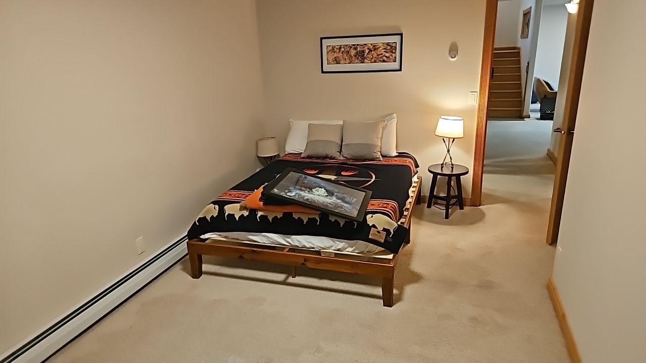 Bedroom interior showing a simple wooden bed frame, mattress, nightstand, and lamp on a carpeted floor, an area affected by the water leak.