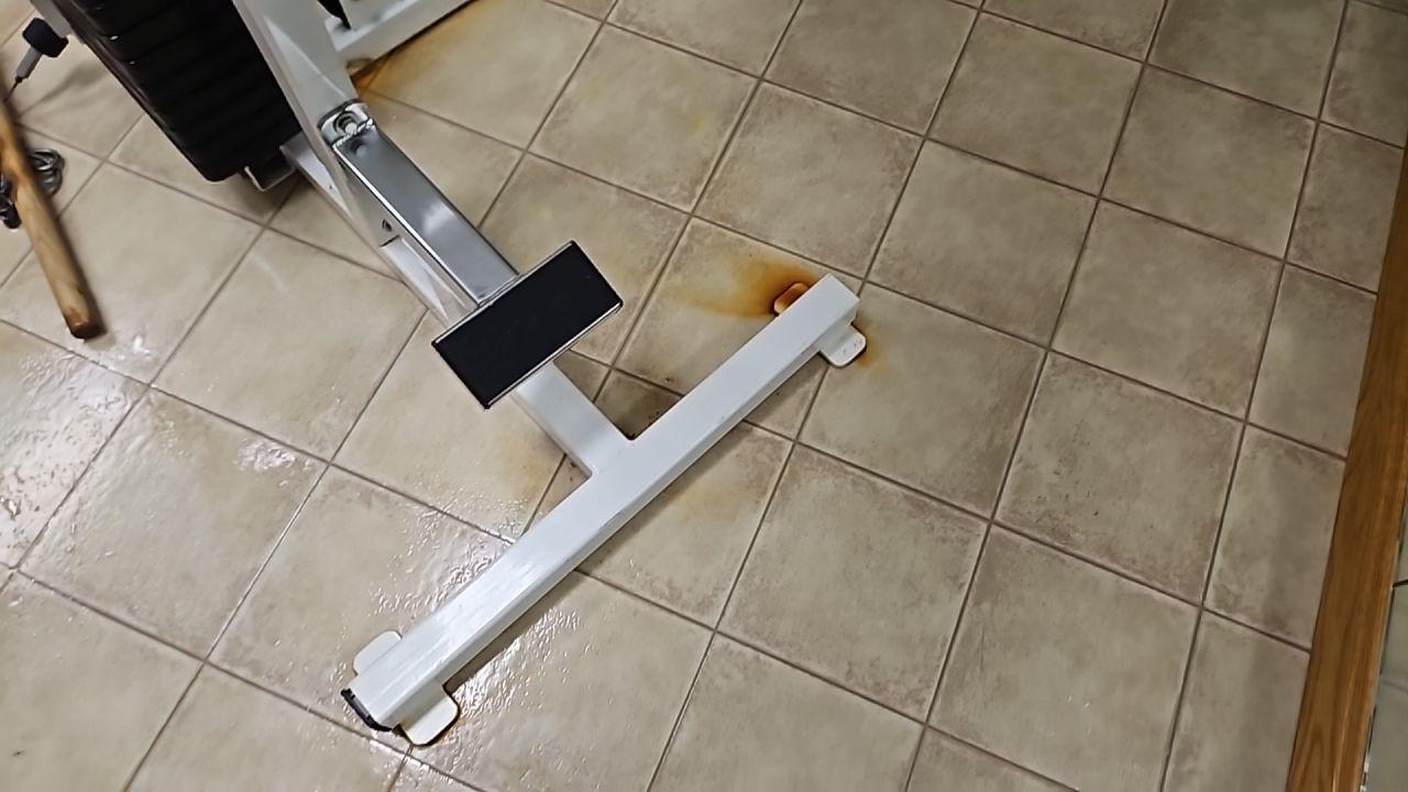 Tiled floor in a home weight room showing rust-colored water stains around the base of exercise equipment, highlighting water damage impact.